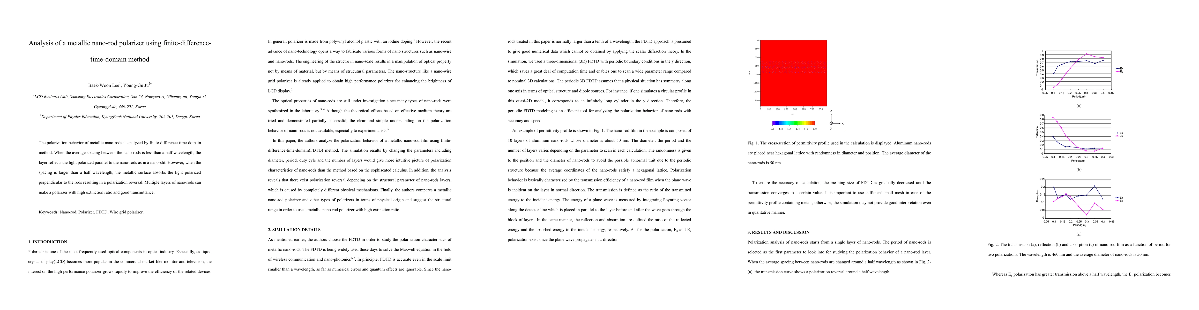 This study analyzes metallic nano-rods' polarization behavior using the finite-difference-time-domain method, revealing that spacing affects light reflection and absorption, leading to polarization reversal and potential for high-efficiency nano-rod polarizers.