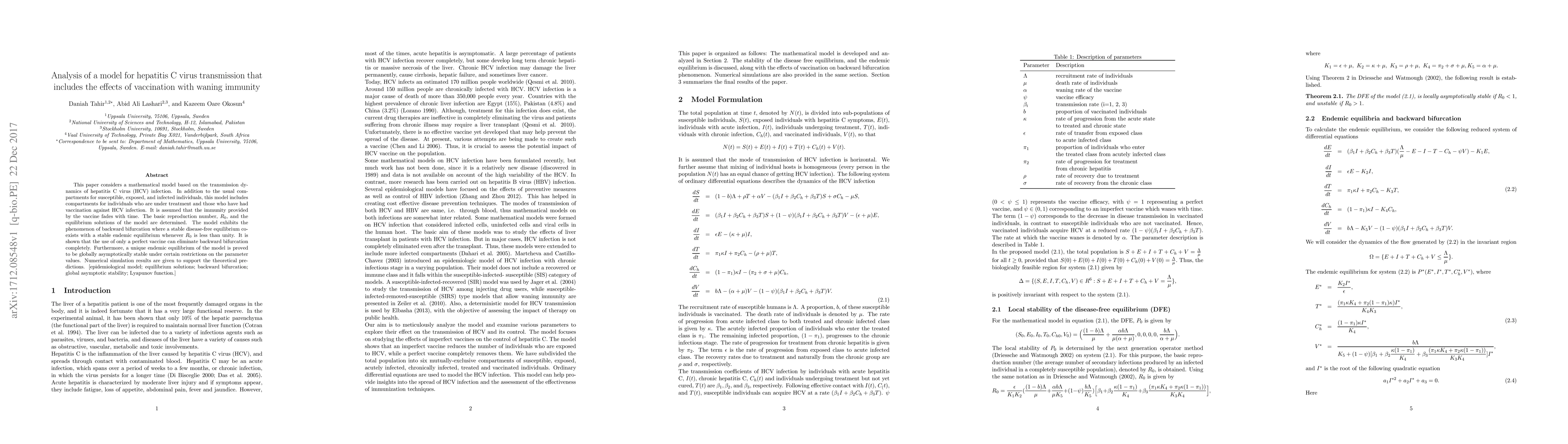 The paper presents a detailed mathematical analysis of an HCV transmission model with vaccination and waning immunity, providing conditions for stability and bifurcation analysis.
