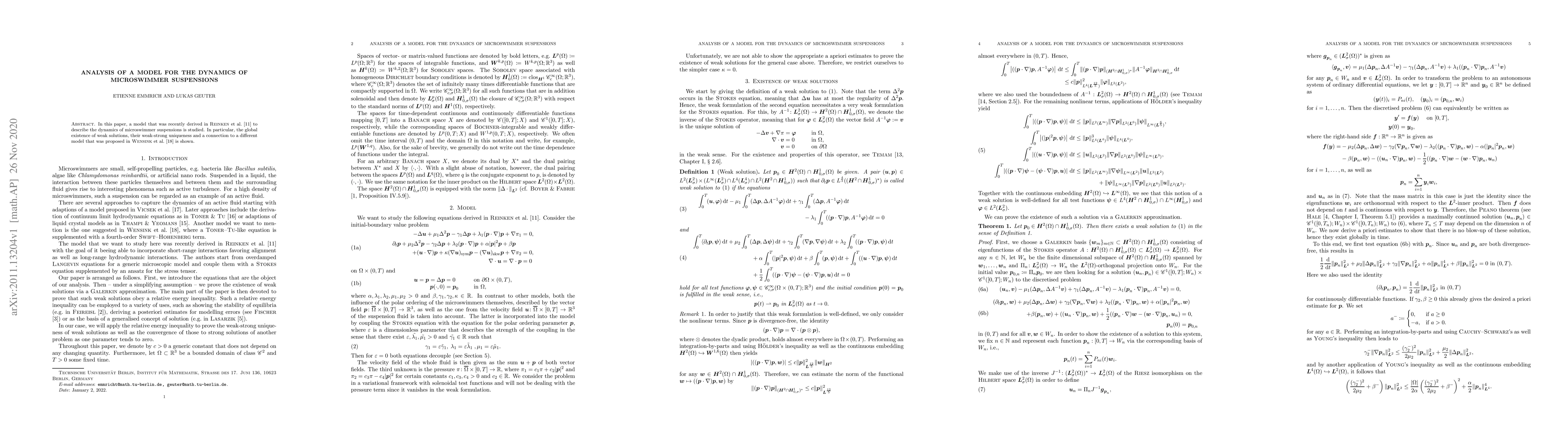 In this paper, a model that was recently derived in Reinken et al. [11] to describe the dynamics of microswimmer suspensions is studied. In particular, the global existence of weak solutions, their weak-strong uniqueness and a connection to a different model that was proposed in Wensink et al. [18] is shown.