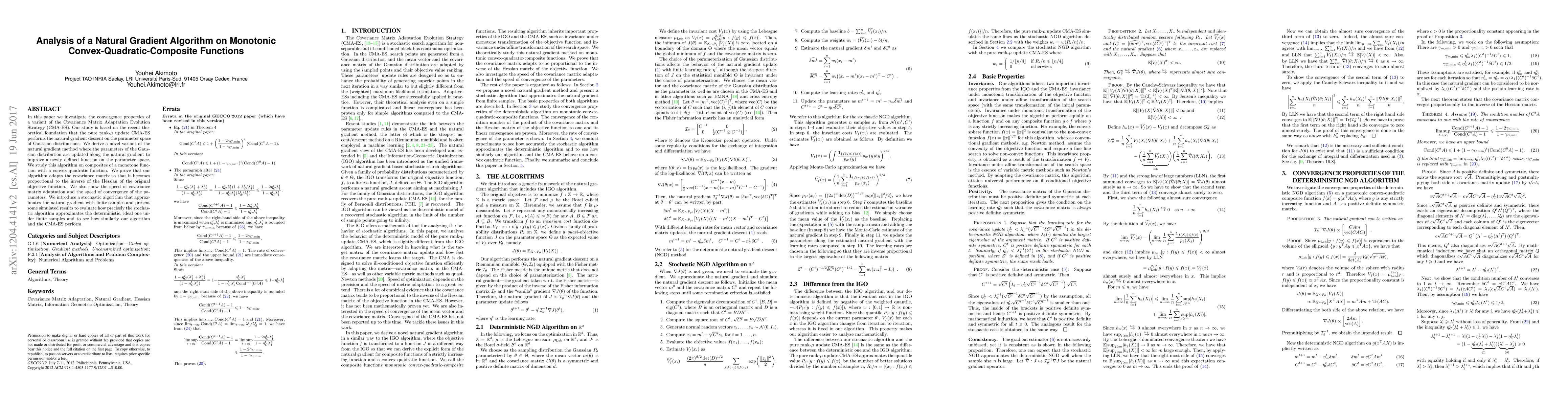In this paper we investigate the convergence properties of a variant of the Covariance Matrix Adaptation Evolution Strategy (CMA-ES). Our study is based on the recent theoretical foundation that the pure rank-mu update CMA-ES performs the natural gradient descent on the parameter space of Gaussian distributions. We derive a novel variant of the natural gradient method where the parameters of the Gaussian distribution are updated along the natural gradient to improve a newly defined function on the parameter space. We study this algorithm on composites of a monotone function with a convex quadratic function. We prove that our algorithm adapts the covariance matrix so that it becomes proportional to the inverse of the Hessian of the original objective function. We also show the speed of covariance matrix adaptation and the speed of convergence of the parameters. We introduce a stochastic algorithm that approximates the natural gradient with finite samples and present some simulated results to evaluate how precisely the stochastic algorithm approximates the deterministic, ideal one under finite samples and to see how similarly our algorithm and the CMA-ES perform.