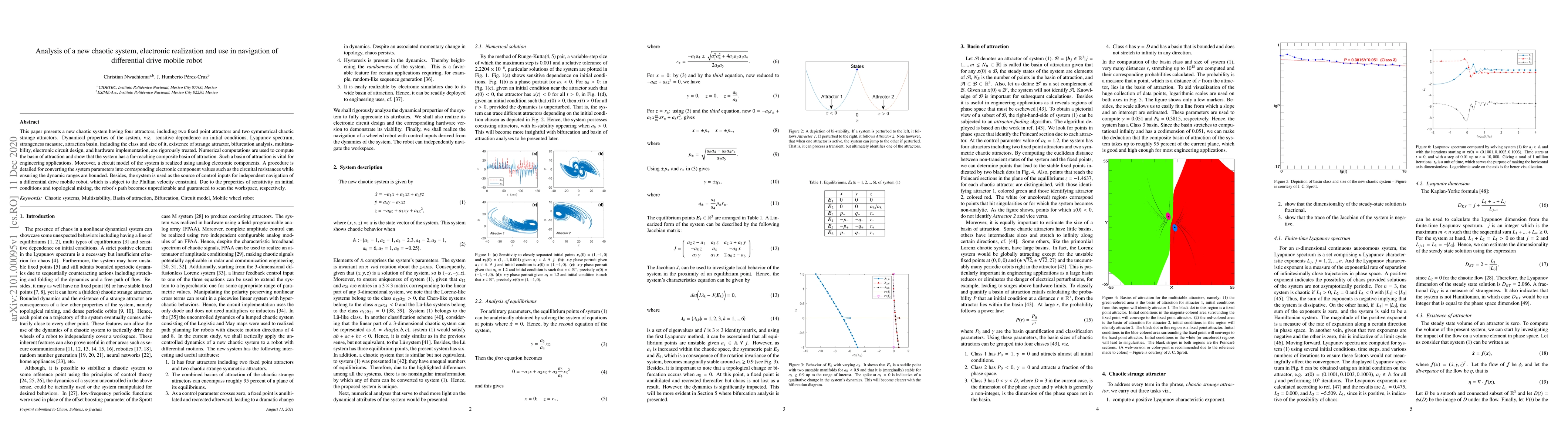 This paper presents a new chaotic system having four attractors, including two fixed point attractors and two symmetrical chaotic strange attractors. Dynamical properties of the system, viz. sensitive dependence on initial conditions, Lyapunov spectrum, strangeness measure, attraction basin, including the class and size of it, existence of strange attractor, bifurcation analysis, multistability, electronic circuit design, and hardware implementation, are rigorously treated. Numerical computations are used to compute the basin of attraction and show that the system has a far-reaching composite basin of attraction. Such a basin of attraction is vital for engineering applications. Moreover, a circuit model of the system is realized using analog electronic components. A procedure is detailed for converting the system parameters into corresponding electronic component values such as the circuital resistances while ensuring the dynamic ranges are bounded. Besides, the system is used as the source of control inputs for independent navigation of a differential drive mobile robot, which is subject to the Pfaffian velocity constraint. Due to the properties of sensitivity on initial conditions and topological mixing, the robot's path becomes unpredictable and guaranteed to scan the workspace, respectively.
