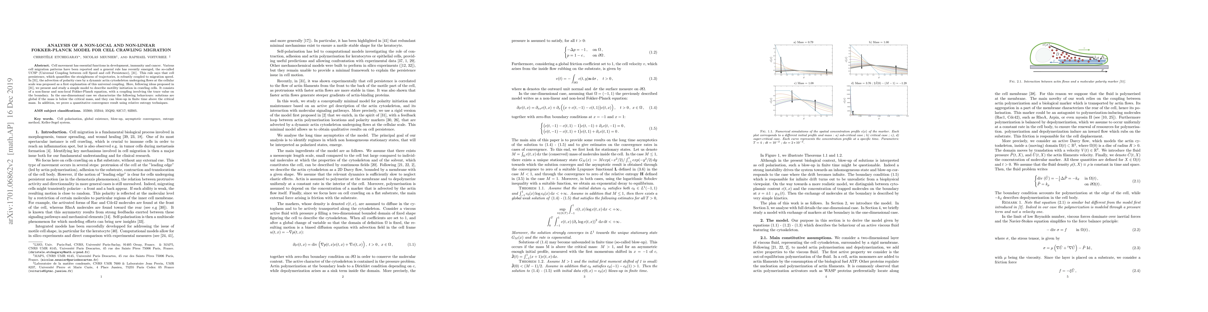This paper analyzes a non-local, non-linear Fokker-Planck model to describe the initiation of motility in crawling cells, revealing that solutions can blow-up above a critical mass and proving convergence using relative entropy techniques. The model explores the universal coupling between cell speed and persistence in cell migration.