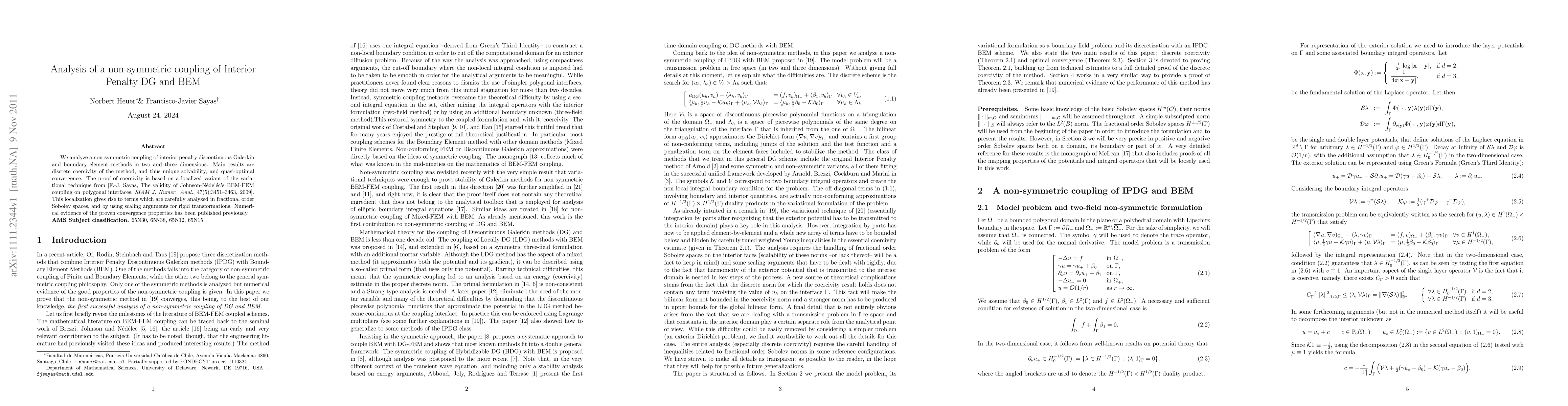 This research paper analyzes a non-symmetric coupling of interior penalty discontinuous Galerkin and boundary element methods, proving discrete coercivity and quasi-optimal convergence in two and three dimensions.