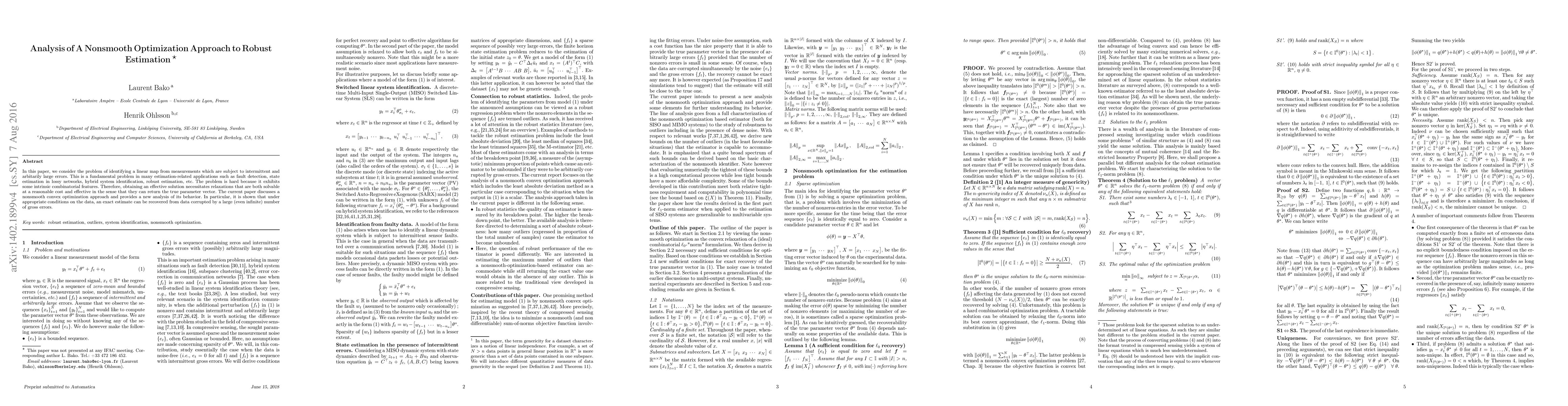In this paper, we consider the problem of identifying a linear map from measurements which are subject to intermittent and arbitarily large errors. This is a fundamental problem in many estimation-related applications such as fault detection, state estimation in lossy networks, hybrid system identification, robust estimation, etc. The problem is hard because it exhibits some intrinsic combinatorial features. Therefore, obtaining an effective solution necessitates relaxations that are both solvable at a reasonable cost and effective in the sense that they can return the true parameter vector. The current paper discusses a nonsmooth convex optimization approach and provides a new analysis of its behavior. In particular, it is shown that under appropriate conditions on the data, an exact estimate can be recovered from data corrupted by a large (even infinite) number of gross errors.