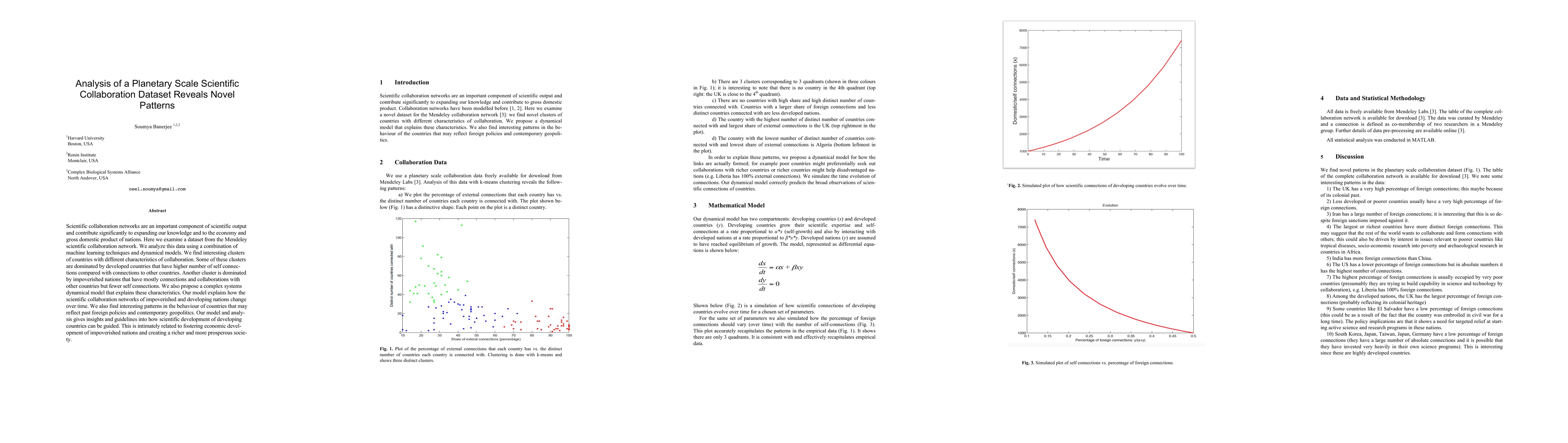 Scientific collaboration networks are an important component of scientific output and contribute significantly to expanding our knowledge and to the economy and gross domestic product of nations. Here we examine a dataset from the Mendeley scientific collaboration network. We analyze this data using a combination of machine learning techniques and dynamical models. We find interesting clusters of countries with different characteristics of collaboration. Some of these clusters are dominated by developed countries that have higher number of self connections compared with connections to other countries. Another cluster is dominated by impoverished nations that have mostly connections and collaborations with other countries but fewer self connections. We also propose a complex systems dynamical model that explains these characteristics. Our model explains how the scientific collaboration networks of impoverished and developing nations change over time. We also find interesting patterns in the behaviour of countries that may reflect past foreign policies and contemporary geopolitics. Our model and analysis gives insights and guidelines into how scientific development of developing countries can be guided. This is intimately related to fostering economic development of impoverished nations and creating a richer and more prosperous society.