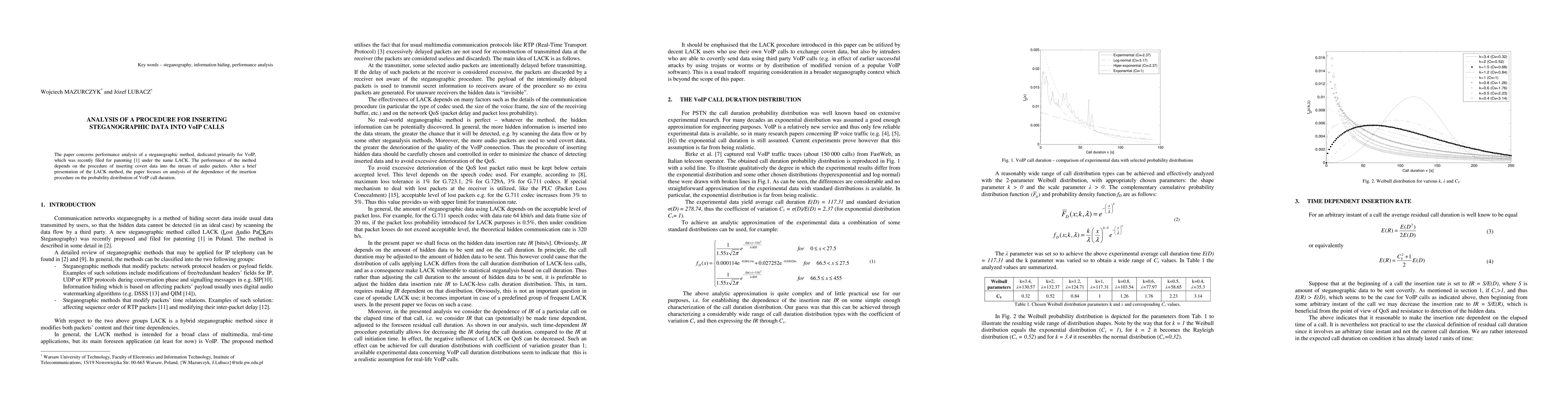This paper analyzes the performance of the LACK steganographic method for embedding covert data into VoIP calls, focusing on how the insertion procedure affects the probability distribution of call durations. The study aims to understand the method's efficiency and its impact on VoIP call quality.