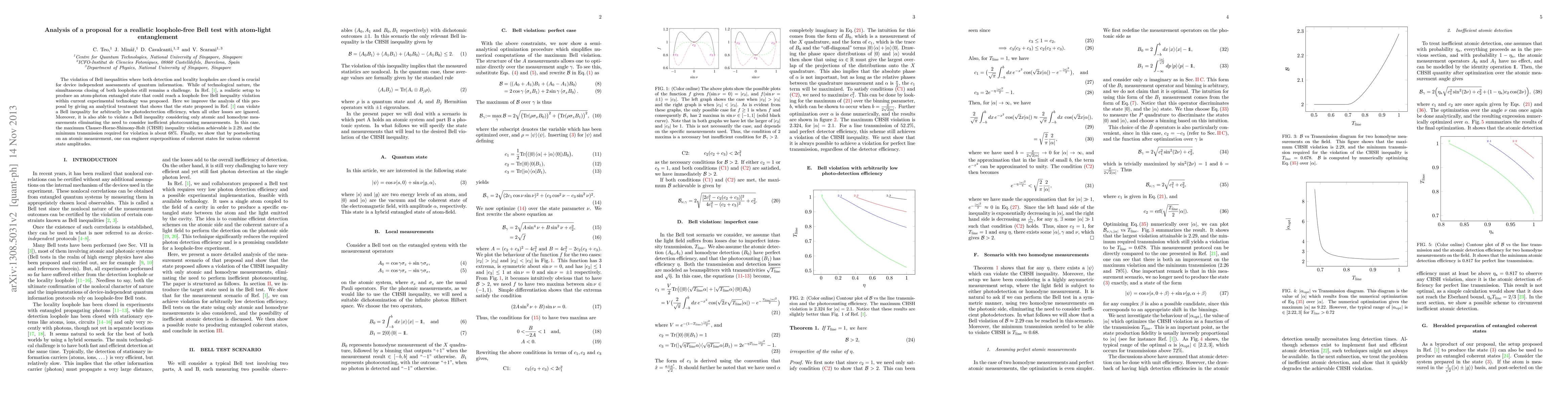 This paper analyzes a proposal for a loophole-free Bell test using atom-light entanglement, demonstrating that the proposed setup can violate Bell inequalities even with low photodetection efficiency. The analysis shows a maximum CHSH inequality violation of 2.29 and a minimum transmission requirement of 68%.