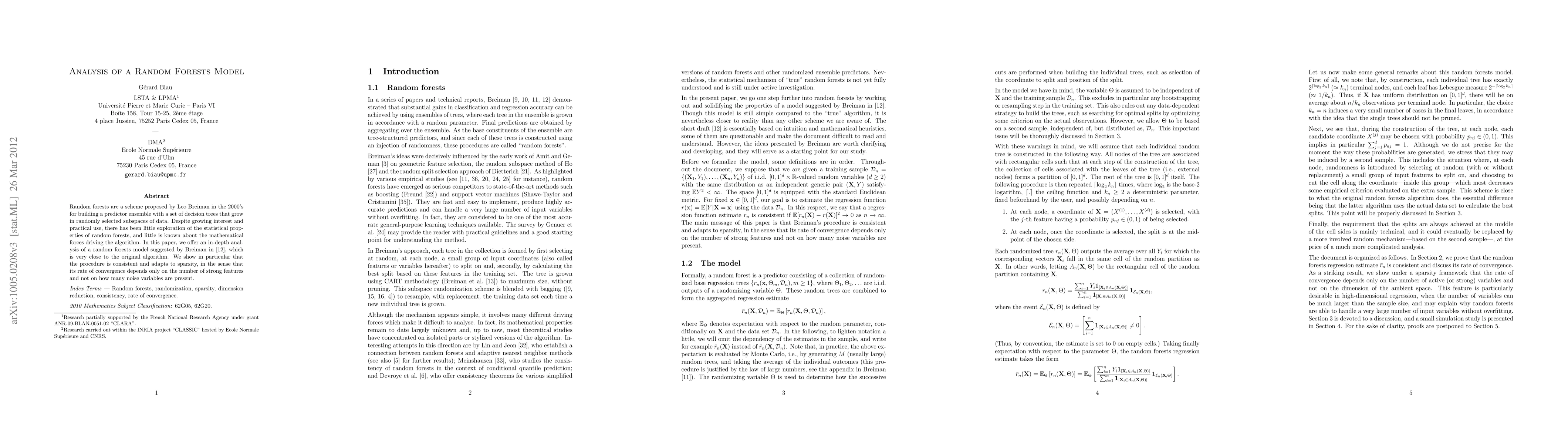 Random forests are a scheme proposed by Leo Breiman in the 2000's for building a predictor ensemble with a set of decision trees that grow in randomly selected subspaces of data. Despite growing interest and practical use, there has been little exploration of the statistical properties of random forests, and little is known about the mathematical forces driving the algorithm. In this paper, we offer an in-depth analysis of a random forests model suggested by Breiman in \cite{Bre04}, which is very close to the original algorithm. We show in particular that the procedure is consistent and adapts to sparsity, in the sense that its rate of convergence depends only on the number of strong features and not on how many noise variables are present.