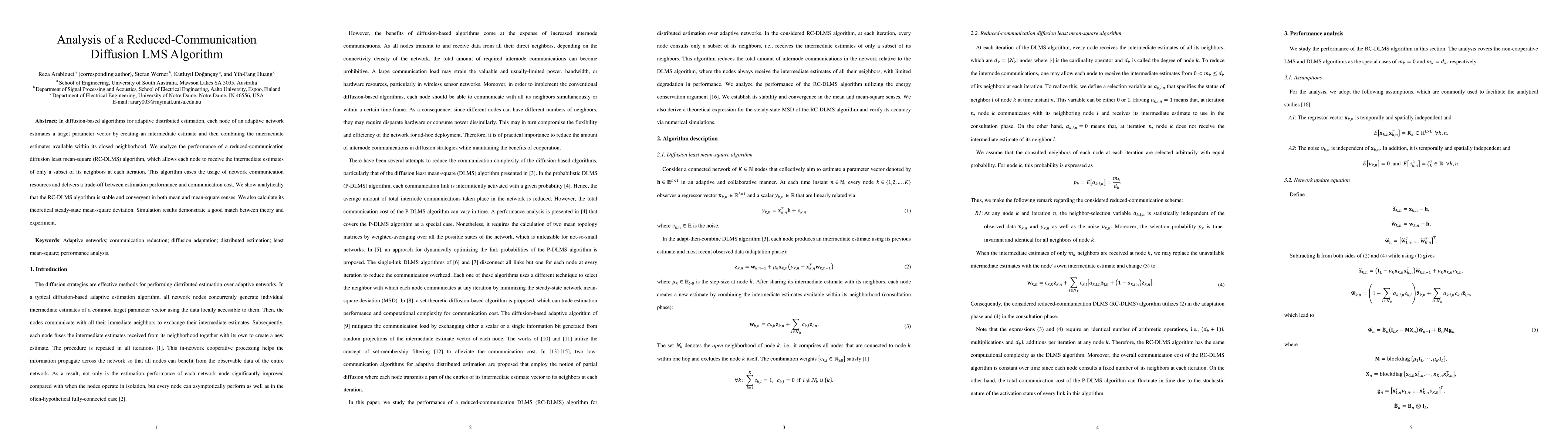 This paper analyzes a reduced-communication diffusion least mean-square (RC-DLMS) algorithm for adaptive distributed estimation, demonstrating its stability and convergence. The RC-DLMS algorithm minimizes communication by having nodes receive estimates from a subset of neighbors, balancing performance and communication cost.