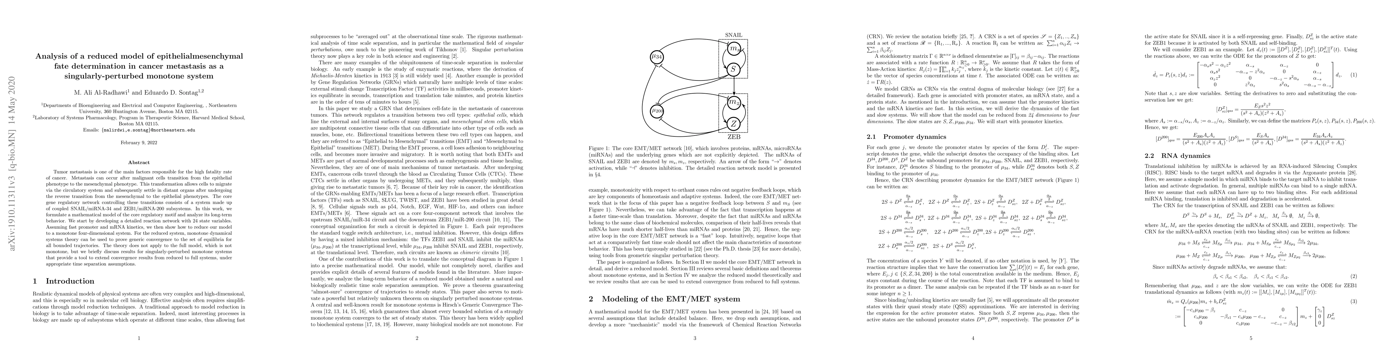 This paper develops a mathematical model to analyze the epithelial-mesenchymal transition in cancer metastasis, focusing on the core gene regulatory network. It reduces a detailed 24-variable reaction network to a four-dimensional monotone system, proving convergence to equilibria using dynamical systems theory.