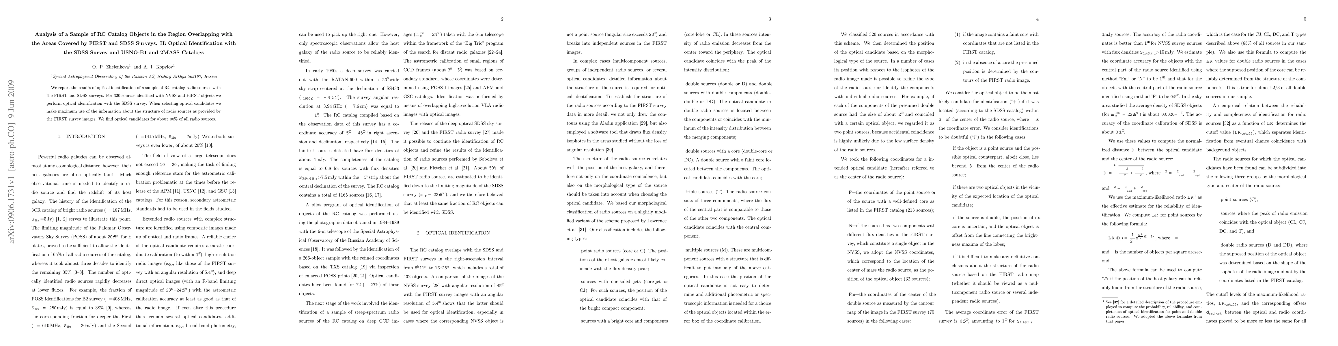 We report the results of optical identification of a sample of RC catalog radio sources with the FIRST and SDSS surveys. For 320 sources identified with NVSS and FIRST objects we perform optical identification with the SDSS survey. When selecting optical candidates we make maximum use of the information about the structure of radio sources as provided by the FIRST survey images. We find optical candidates for about 80% of all radio sources.