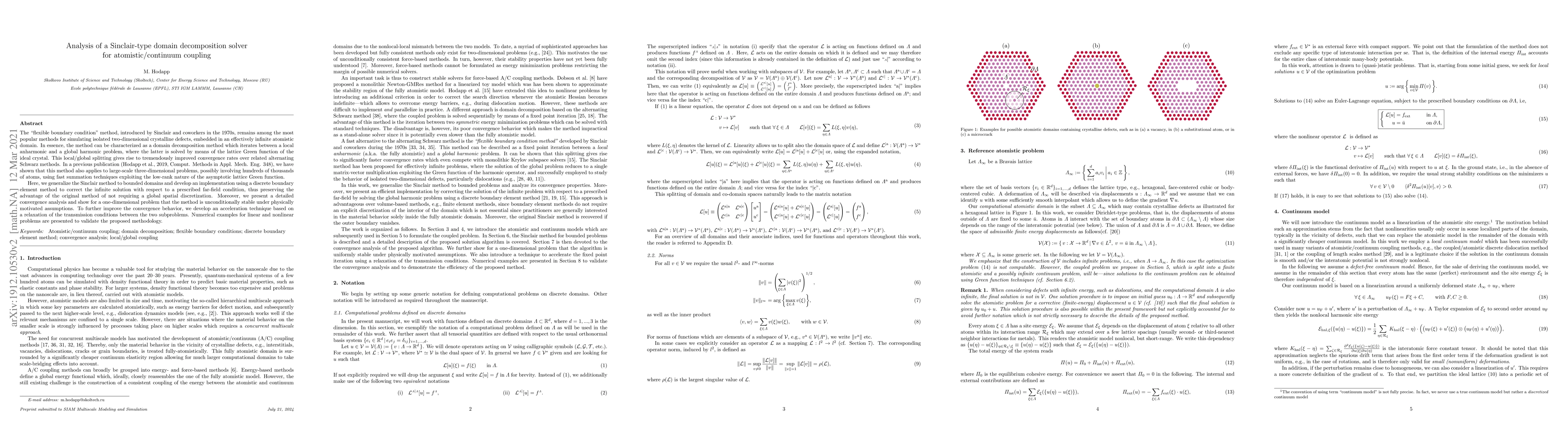 The "flexible boundary condition" method, introduced by Sinclair and coworkers in the 1970s, remains among the most popular methods for simulating isolated two-dimensional crystalline defects, embedded in an effectively infinite atomistic domain. In essence, the method can be characterized as a domain decomposition method which iterates between a local anharmonic and a global harmonic problem, where the latter is solved by means of the lattice Green function of the ideal crystal. This local/global splitting gives rise to tremendously improved convergence rates over related alternating Schwarz methods. In a previous publication (Hodapp et al., 2019, Comput. Methods in Appl. Mech. Eng. 348), we have shown that this method also applies to large-scale three-dimensional problems, possibly involving hundreds of thousands of atoms, using fast summation techniques exploiting the low-rank nature of the asymptotic lattice Green function. Here, we generalize the Sinclair method to bounded domains and develop an implementation using a discrete boundary element method to correct the infinite solution with respect to a prescribed far-field condition, thus preserving the advantage of the original method of not requiring a global spatial discretization. Moreover, we present a detailed convergence analysis and show for a one-dimensional problem that the method is unconditionally stable under physically motivated assumptions. To further improve the convergence behavior, we develop an acceleration technique based on a relaxation of the transmission conditions between the two subproblems. Numerical examples for linear and nonlinear problems are presented to validate the proposed methodology.