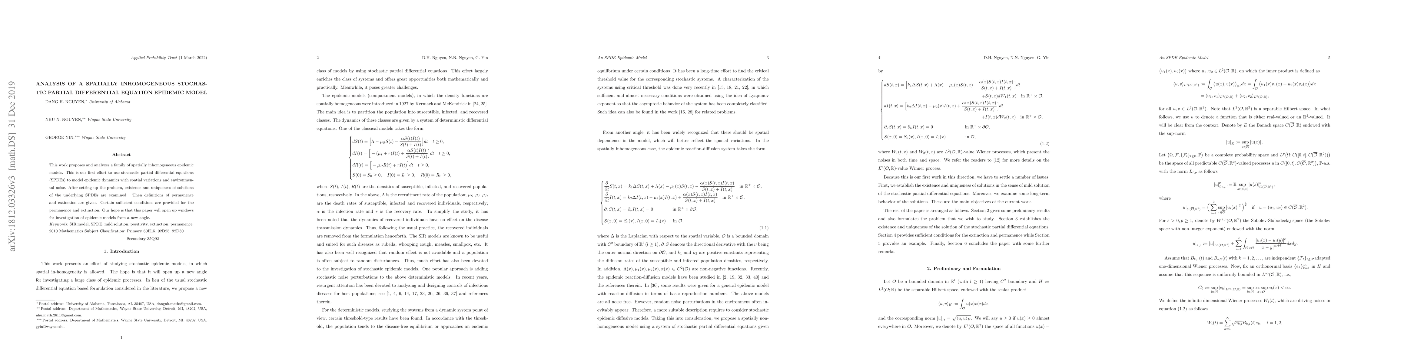 This paper proposes a spatially inhomogeneous epidemic model using stochastic partial differential equations (SPDEs) to account for spatial variations and environmental noise. It examines the existence and uniqueness of solutions, and provides conditions for permanence and extinction.