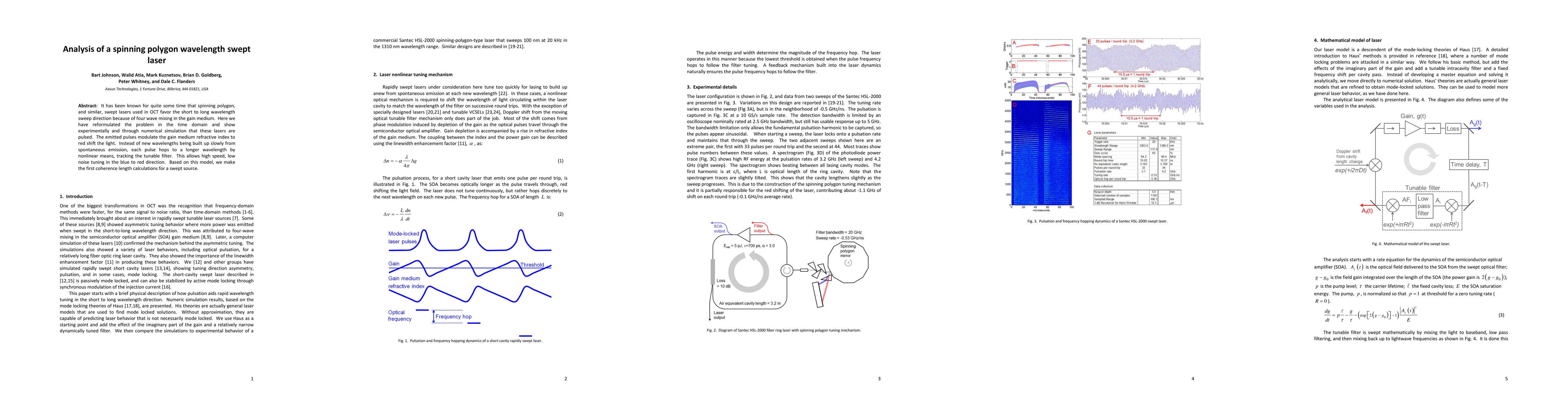 This paper analyzes a spinning polygon wavelength swept laser, revealing that it operates in a pulsed manner, with each pulse shifting to longer wavelengths via nonlinear modulation. This mechanism enables high-speed, low-noise tuning across the blue to red spectrum, and the study provides the first coherence length calculations for such swept sources.