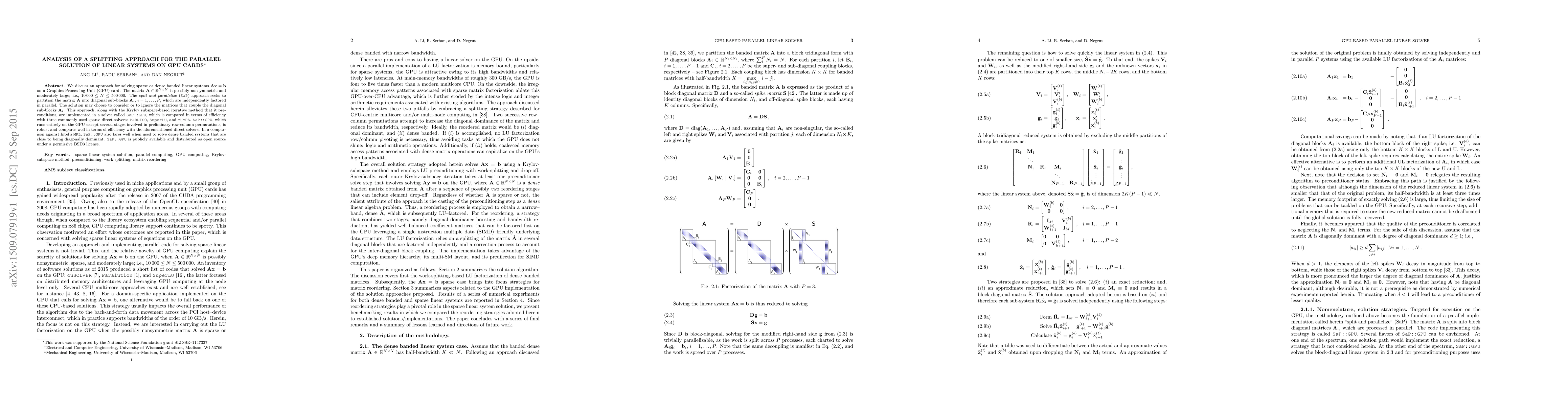 This paper proposes a "split and parallelize" (SaP) approach for solving large linear systems on GPU cards, partitioning the matrix into diagonal sub-blocks for parallel factorization. The SaP::GPU solver, which runs mostly on the GPU, compares favorably in efficiency to direct solvers like PARDISO, SuperLU, and MUMPS, especially for dense banded systems.