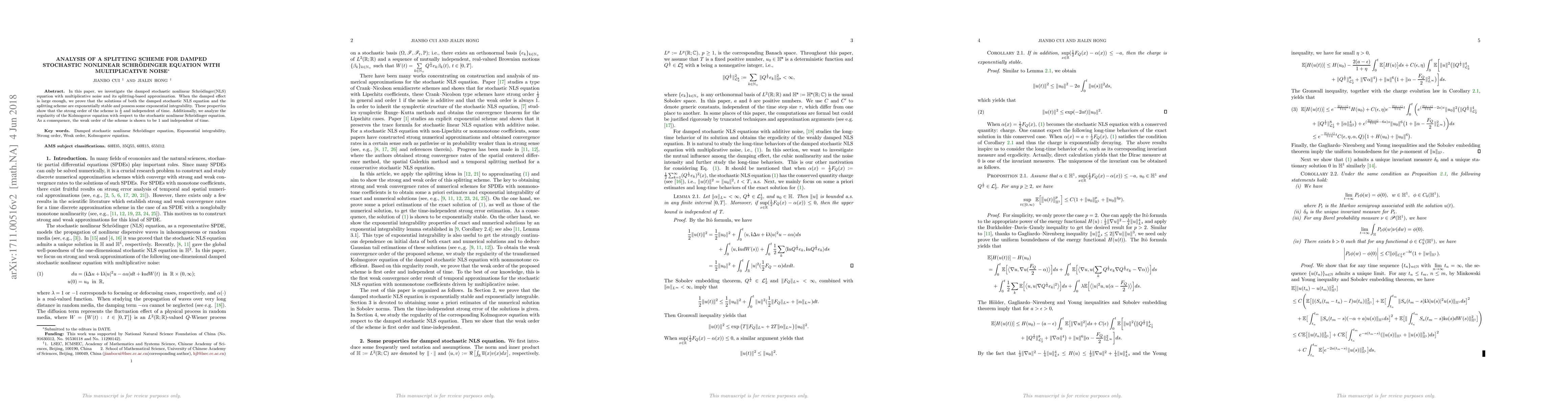 This paper analyzes a splitting scheme for the damped stochastic nonlinear Schrödinger equation with multiplicative noise, proving exponential stability and integrability for both the equation and the scheme. The strong order of the scheme is shown to be $\frac{1}{2}$, independent of time, while the weak order is twice the strong order, also time-independent.