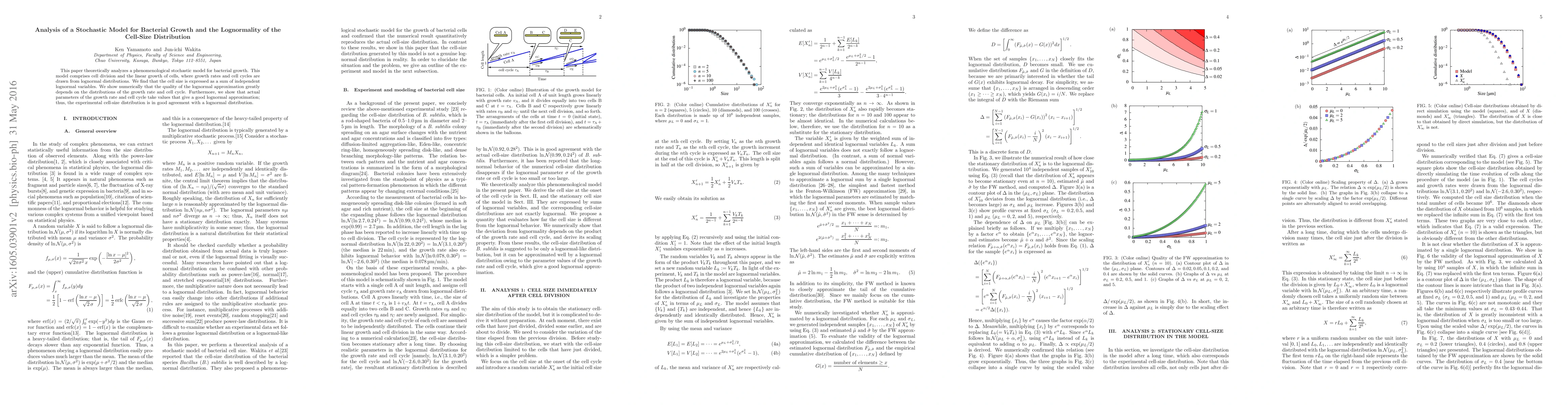 This paper analyzes a stochastic model for bacterial growth, demonstrating that cell size follows a lognormal distribution due to the lognormal nature of growth rates and cell cycles. The study finds that the lognormal approximation's accuracy depends on these parameters, which in practice align well with lognormal distributions, validating the model's predictions.