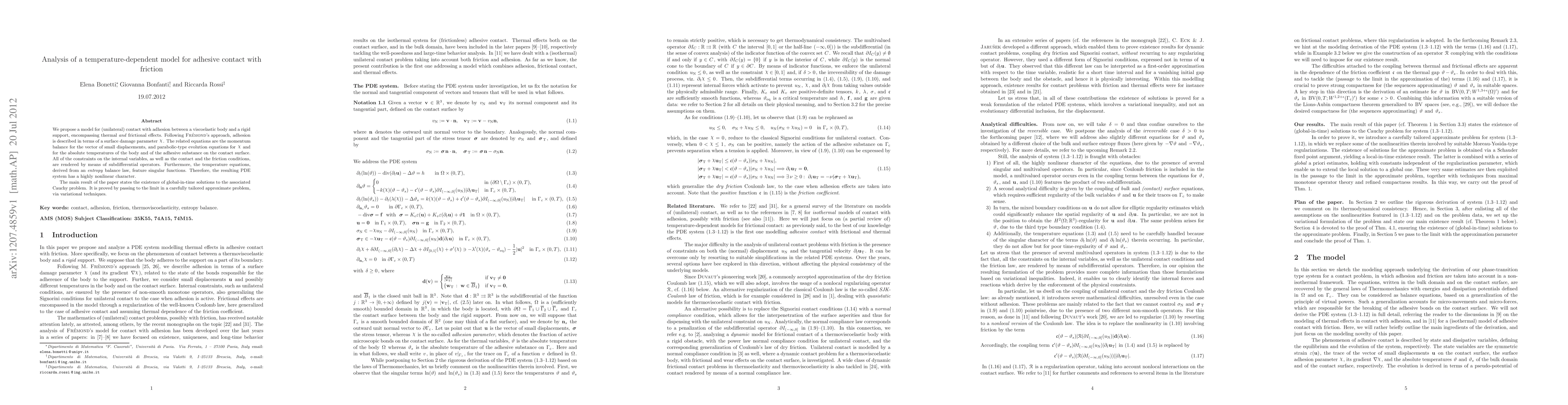 A new model has been developed to analyze adhesive contact with friction, considering thermal effects, and it has shown the existence of global solutions to a Cauchy problem.