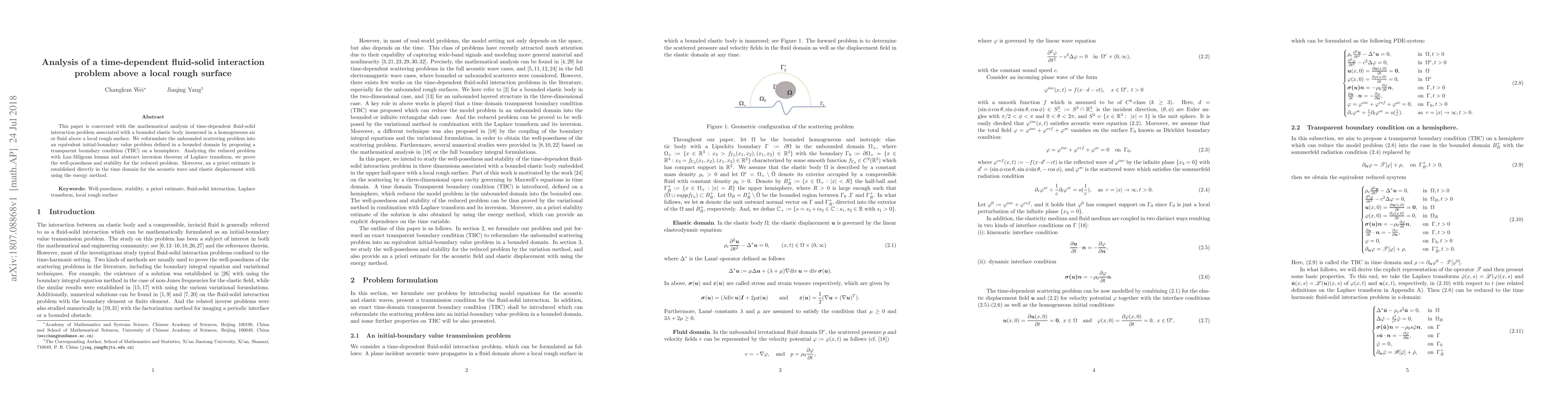 This paper analyzes a time-dependent fluid-solid interaction problem involving a bounded elastic body above a local rough surface, reformulating it into a bounded domain problem with a transparent boundary condition. It proves well-posedness and stability using the Lax-Milgram lemma and Laplace transform.