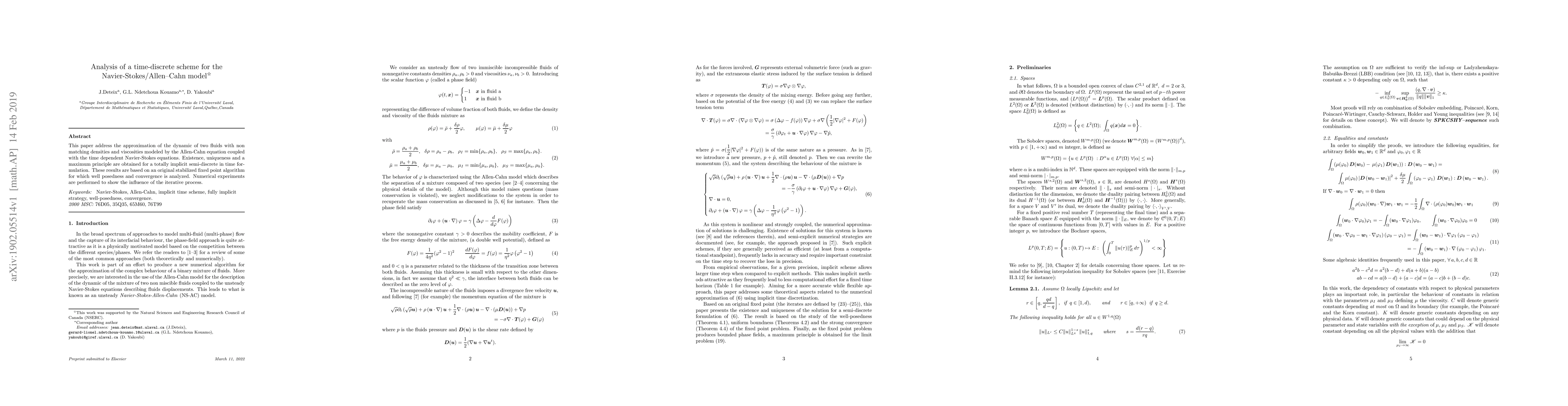 This paper analyzes a time-discrete scheme for modeling two fluids with different densities and viscosities, establishing existence, uniqueness, and maximum principle bounds for the solution. Numerical experiments demonstrate the influence of the iterative process on the algorithm's performance.
