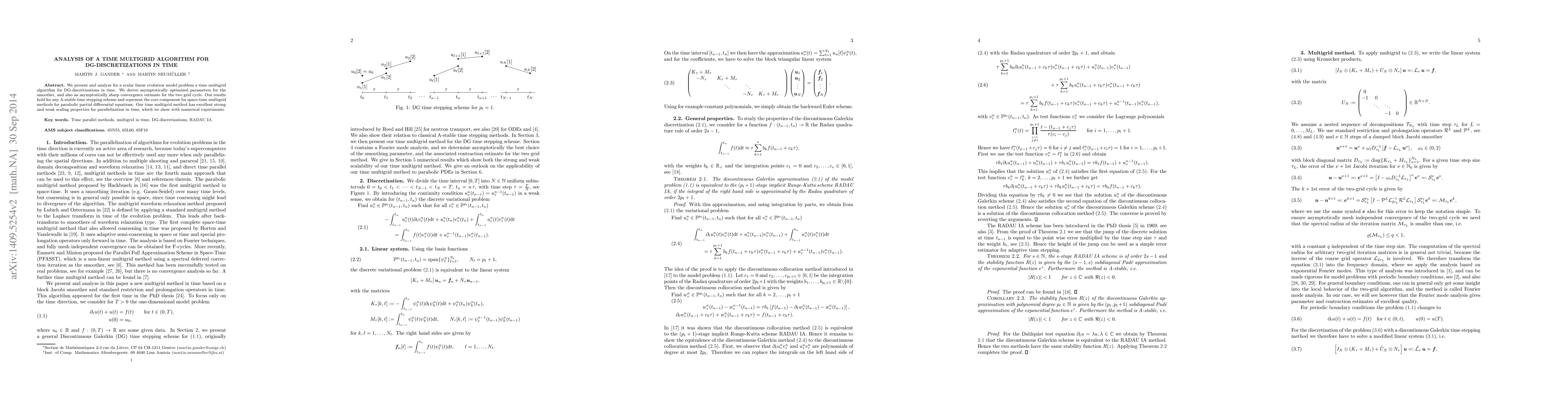 This paper develops and analyzes a time multigrid algorithm for DG-discretizations in time for linear evolution problems, deriving optimized parameters and convergence estimates. Numerical experiments demonstrate strong and weak scaling properties for parallelization.