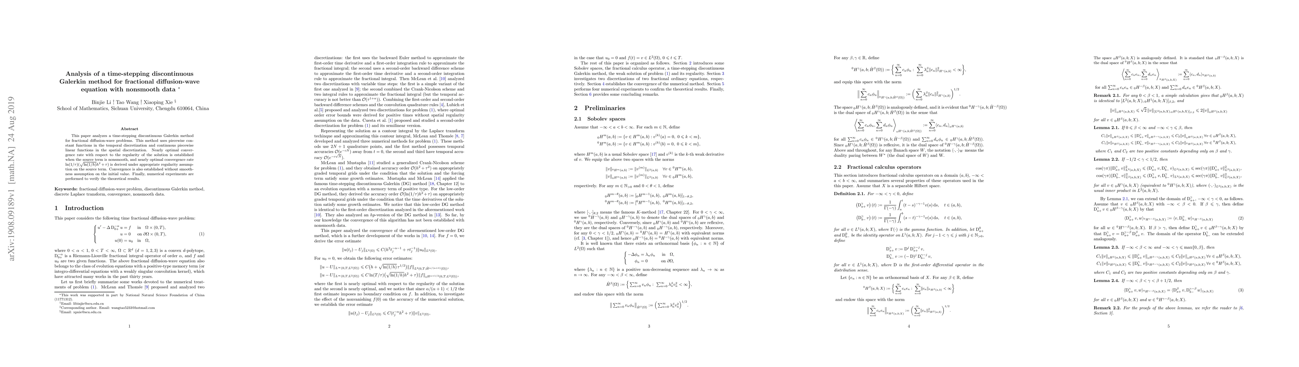 This paper analyzes a time-stepping discontinuous Galerkin method for fractional diffusion-wave equations, demonstrating nearly optimal convergence rates even with nonsmooth data, and validating the results with numerical experiments.