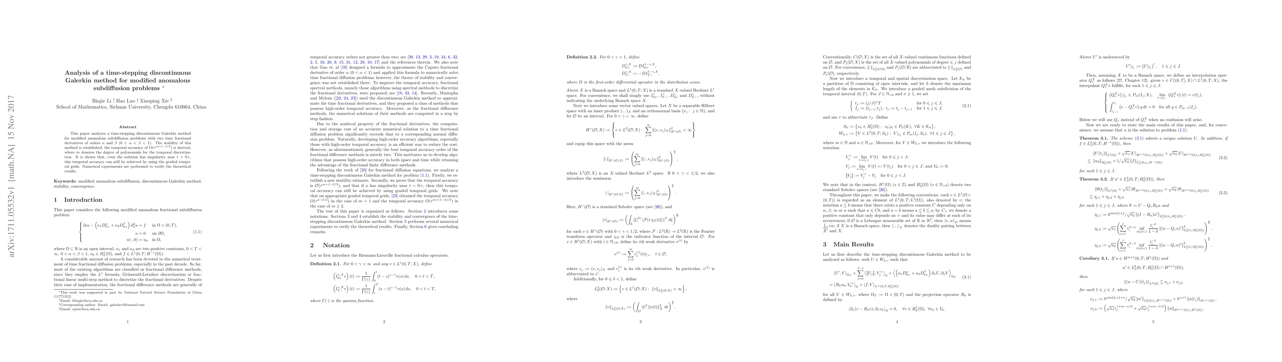This paper presents a time-stepping discontinuous Galerkin method for solving modified anomalous subdiffusion problems with time fractional derivatives. The method demonstrates stability and temporal accuracy of $O(\tau^{m+1-\beta/2})$, verified through numerical experiments, even for solutions with singularities near $t=0$.