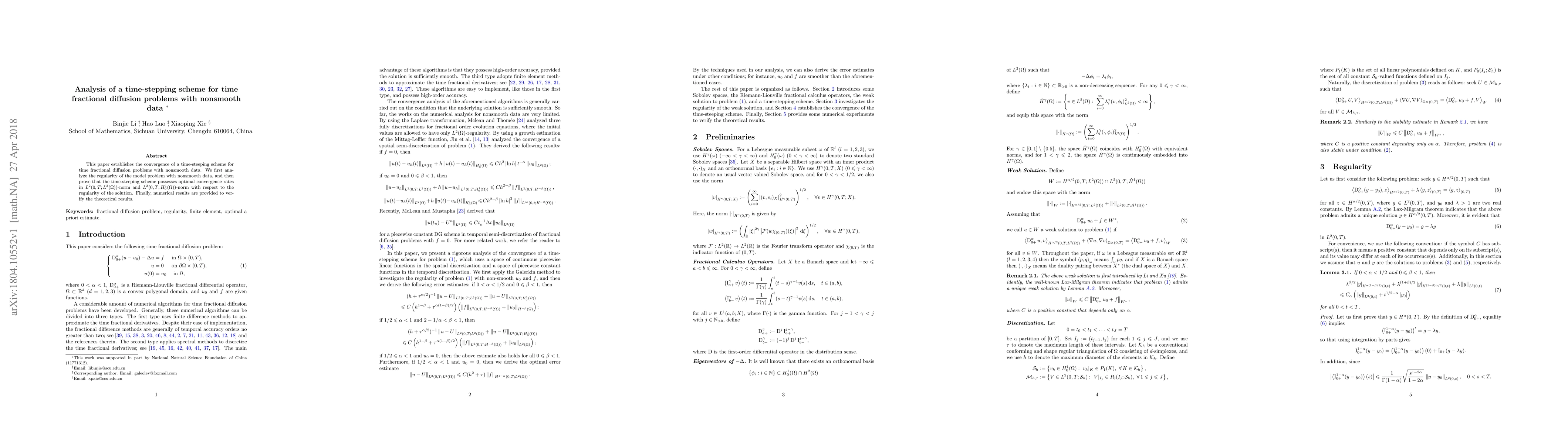 This paper proves the convergence of a time-stepping scheme for time fractional diffusion problems with nonsmooth data, demonstrating optimal convergence rates in specified norms, and verifies the theoretical results with numerical simulations.