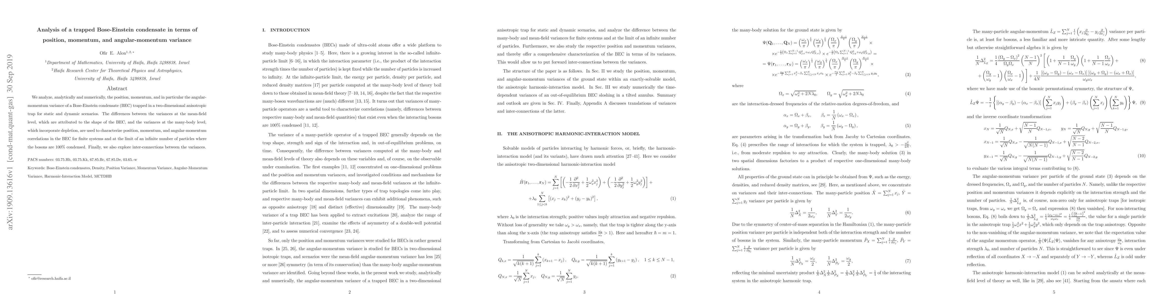 This paper analyzes the variances of position, momentum, and angular momentum in a trapped Bose-Einstein condensate (BEC) using both analytical and numerical methods. It compares mean-field and many-body level variances to characterize correlations in finite and infinite particle systems, and explores interconnections between these variances.
