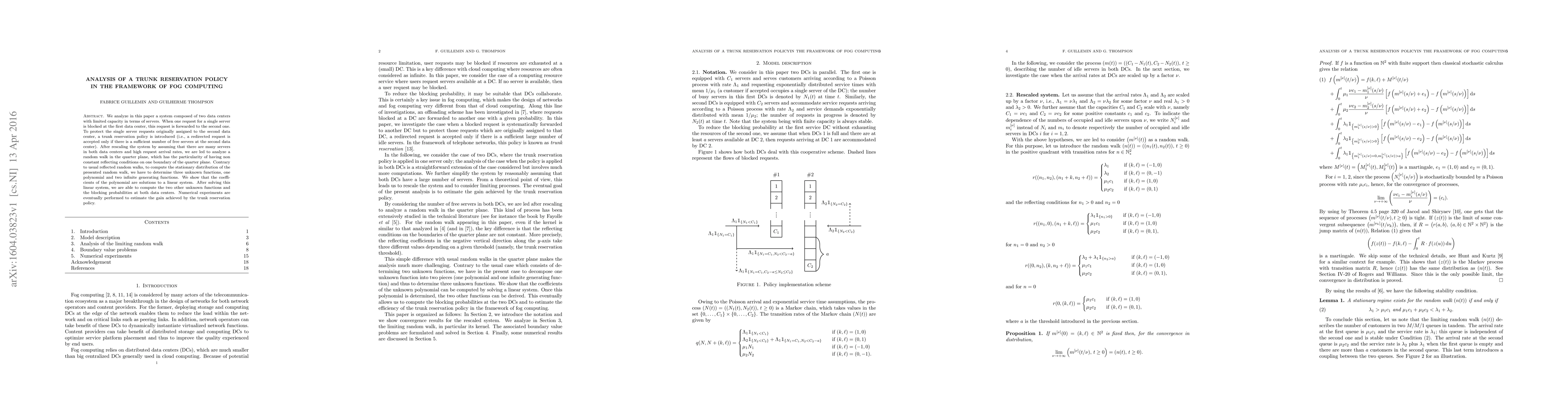 A trunk reservation policy is analyzed in fog computing to improve server blocking rates. The research finds that the policy reduces blocking probabilities through a complex random walk model.