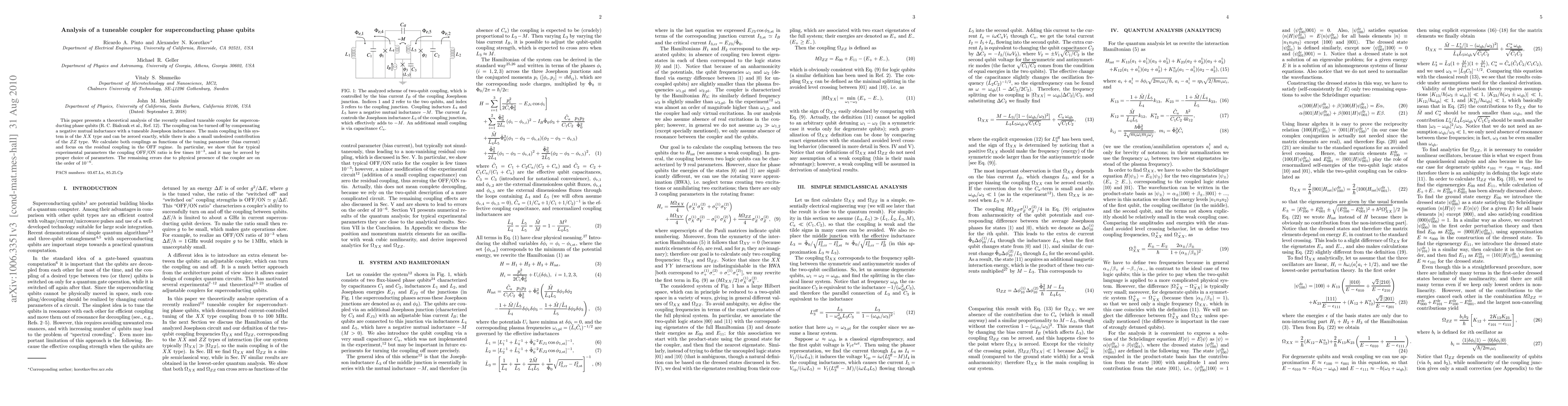 This paper analyzes a tuneable coupler for superconducting phase qubits, focusing on the $XX$ coupling that can be zeroed exactly and the residual $ZZ$ coupling. The study finds that the OFF/ON coupling ratio is around $10^{-3}$, with the remaining errors due to the coupler being on the order of $10^{-6}$.