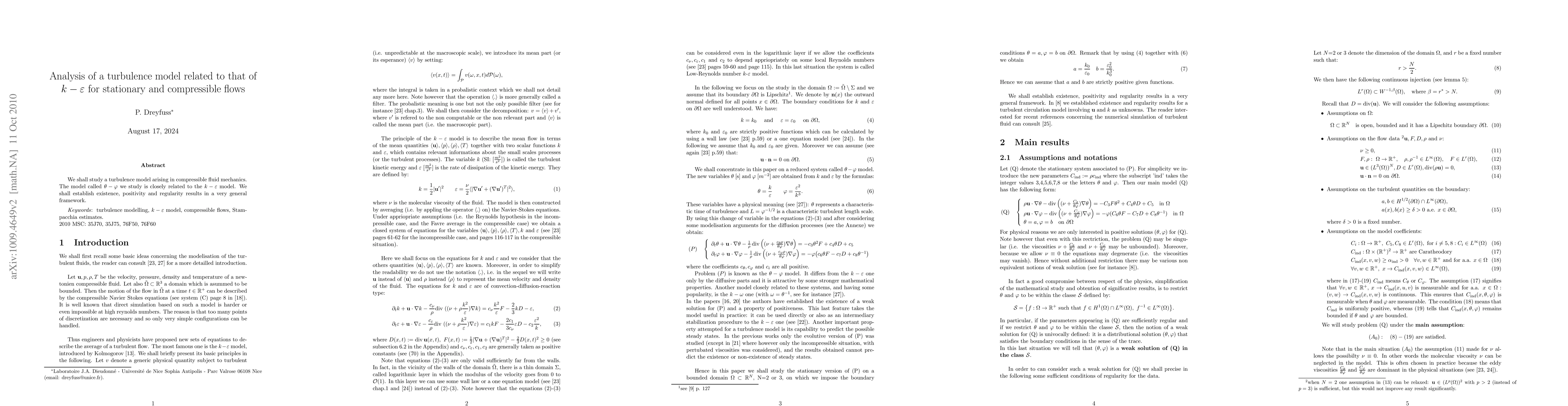 We shall study a turbulence model arising in compressible fluid mechanics. The model called $\theta - \phi$ we study is closely related to the k-epsilon model. We shall establish existence, positivity and regularity results in a very general framework.