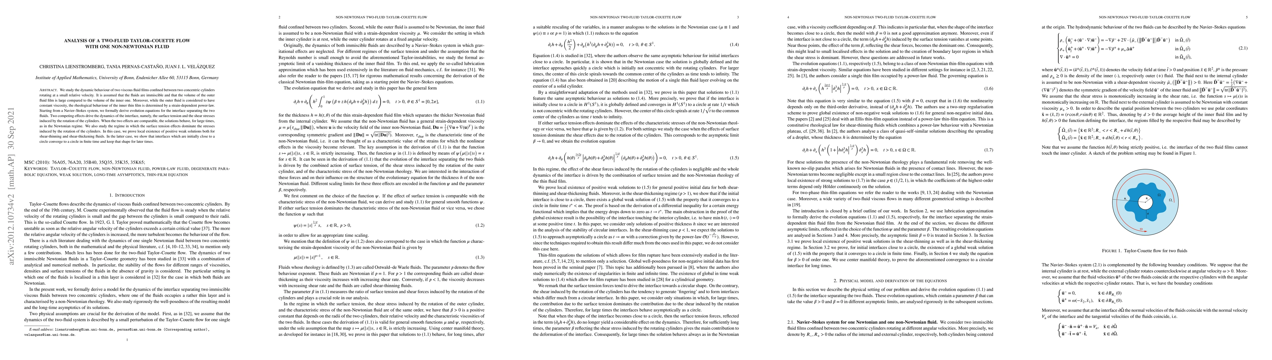 Researchers studied a two-fluid Taylor-Couette flow with one non-Newtonian fluid, finding that in some cases, interfaces between the fluids converge to a circle over time, while in others, surface tension dominates and causes the interface to stabilize.