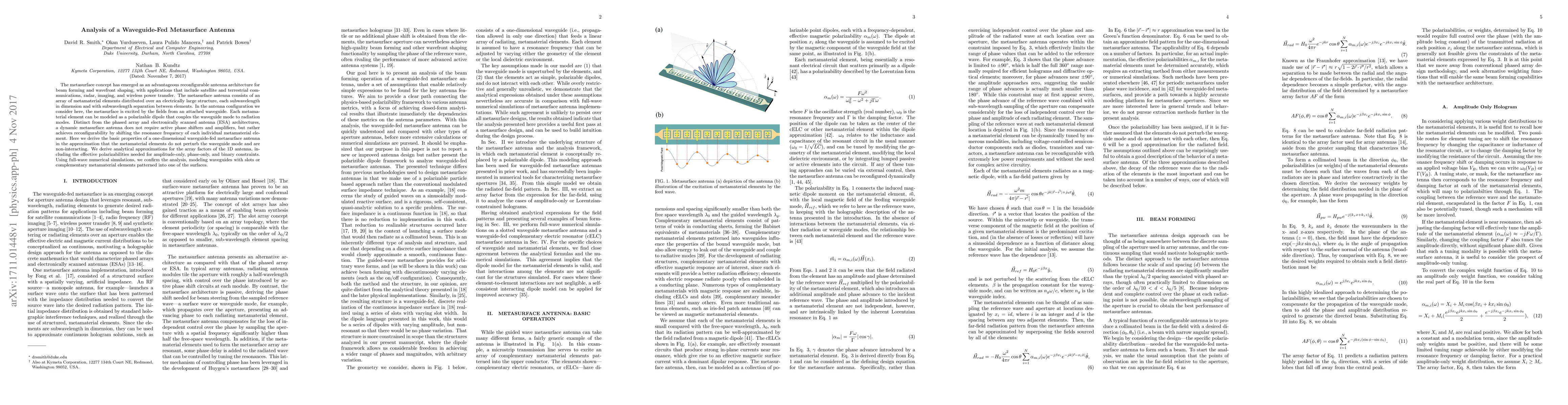 The metasurface concept has emerged as an advantageous reconfigurable antenna architecture for beam forming and wavefront shaping, with applications that include satellite and terrestrial communications, radar, imaging, and wireless power transfer. The metasurface antenna consists of an array of metamaterial elements distributed over an electrically large structure, each subwavelength in dimension and with subwavelength separation between elements. In the antenna configuration we consider here, the metasurface is excited by the fields from an attached waveguide. Each metamaterial element can be modeled as a polarizable dipole that couples the waveguide mode to radiation modes. Distinct from the phased array and electronically scanned antenna (ESA) architectures, a dynamic metasurface antenna does not require active phase shifters and amplifiers, but rather achieves reconfigurability by shifting the resonance frequency of each individual metamaterial element. Here we derive the basic properties of a one-dimensional waveguide-fed metasurface antenna in the approximation that the metamaterial elements do not perturb the waveguide mode and are non-interacting. We derive analytical approximations for the array factors of the 1D antenna, including the effective polarizabilities needed for amplitude-only, phase-only, and binary constraints. Using full-wave numerical simulations, we confirm the analysis, modeling waveguides with slots or complementary metamaterial elements patterned into one of the surfaces.