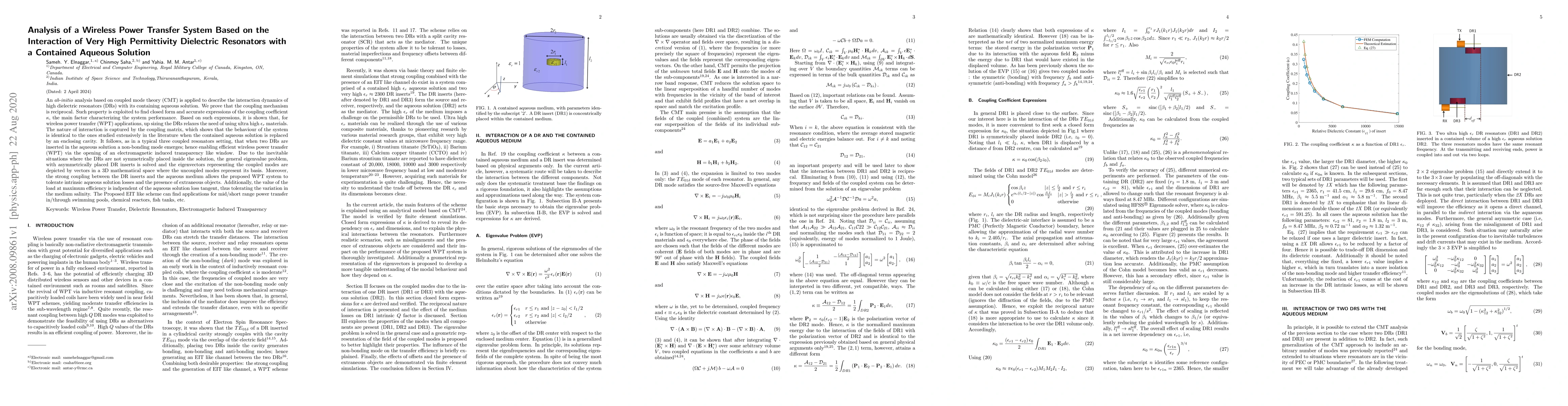 An ab-initio analysis based on coupled mode theory (CMT) is applied to describe the interaction dynamics of high dielectric resonators (DRs) with its containing aqueous solution. We prove that the coupling mechanism is reciprocal. Such property is exploited to find closed form and accurate expressions of the coupling coefficient, the main factor characterizing the system performance. Based on such expressions, it is shown that, for wireless power transfer (WPT) applications, up sizing the DRs relaxes the need of using ultra high dielectric constant materials. The nature of interaction is captured by the coupling matrix, which shows that the behaviour of the system is identical to the ones studied extensively in the literature when the contained aqueous solution is replaced by an enclosing cavity. It follows, as in a typical three coupled resonators setting, that when two DRs are inserted in the aqueous solution a non-bonding mode emerges; hence enabling efficient wireless power transfer (WPT) via the opening of an electromagnetic induced transparency like window. Due to the inevitable situations where the DRs are not symmetrically placed inside the solution, the general eigenvalue problem, with asymmetrically placed DR inserts is solved and the eigenvectors representing the coupled modes are depicted by vectors in a 3D mathematical space where the uncoupled modes represent its basis. Moreover, the strong coupling between the DR inserts and the aqueous medium allows the proposed WPT system to tolerate intrinsic aqueous solution losses and the presence of extraneous objects. Additionally, the value of the load at maximum efficiency is independent of the aqueous solution loss tangent, thus tolerating the variation of the medium salinity. The Proposed EIT like scheme can find applications for mid/short range power transfer in/through swimming pools, chemical reactors, fish tanks, etc.