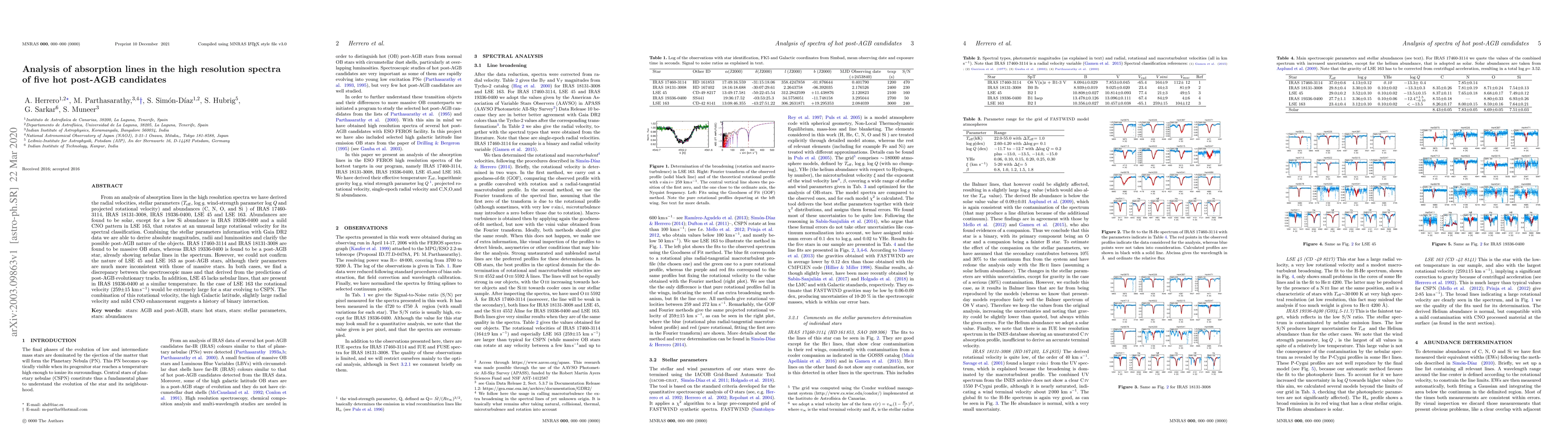 From an analysis of absorption lines in the high resolution spectra we have derived the radial velocities, stellar parameters (Teff, gravity, wind-strength parameter logQ and projected rotational velocity) and abundances (C, N, O, and Si ) of IRAS 17460-3114, IRAS 18131-3008, IRAS 19336-0400, LSE 45 and LSE 163. Abundances are found to be solar, except for a low Si abundance in IRAS 19336-0400 and a mild CNO pattern in LSE 163, that rotates at an unusual large rotational velocity for its spectral classification. Combining the stellar parameters information with Gaia DR2 data we are able to derive absolute magnitudes, radii and luminosities and clarify the possible post-AGB nature of the objects. IRAS 17460-3114 and IRAS 18131-3008 are found to be massive OB stars, whereas IRAS 19336-0400 is found to be a post-AGB star, already showing nebular lines in the spectrum. However, we could not confirm the nature of LSE 45 and LSE 163 as post-AGB stars, although their parameters are much more inconsistent with those of massive stars. In both cases, we find a discrepancy between the spectroscopic mass and that derived from the predictions of post-AGB evolutionary tracks. In addition, LSE 45 lacks nebular lines, that are present in IRAS 19336-0400 at a similar temperature. In the case of LSE 163 the rotational velocity (259+/-15 km/s) would be extremely large for a star evolving to CSPN. The combination of this rotational velocity, the high Galactic latitude, slightly large radial velocity and mild CNO enhancement suggests a history of binary interaction.