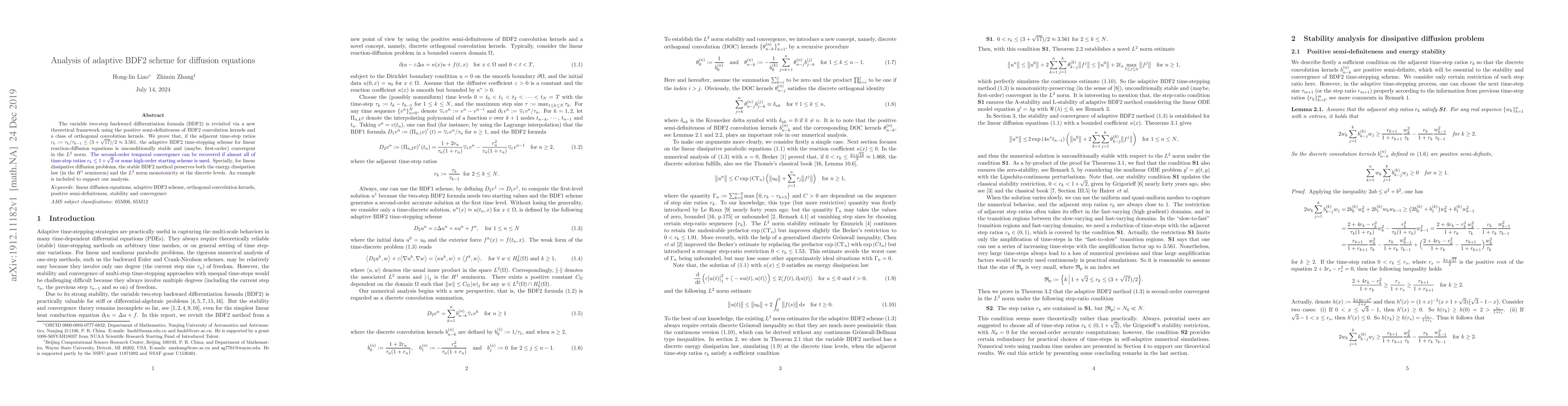 This paper analyzes the adaptive BDF2 scheme for diffusion equations, proving its unconditional stability and convergence under specific time-step ratios. It also shows that second-order temporal convergence can be achieved under certain conditions or with a high-order starting scheme.