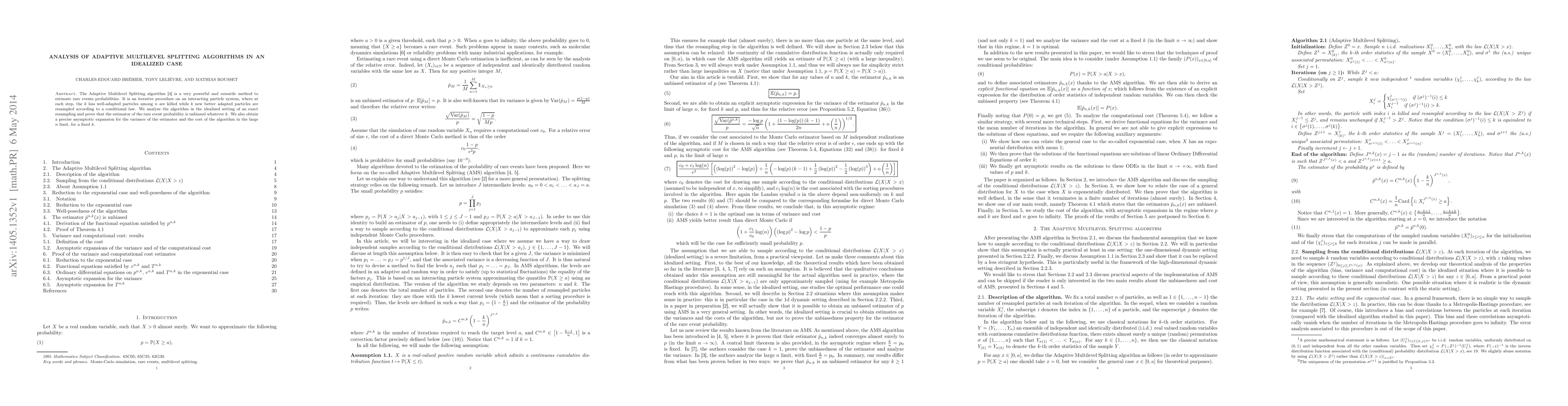 This paper analyzes the Adaptive Multilevel Splitting algorithm, showing it provides an unbiased estimator for rare event probabilities in an idealized setting. It also derives an asymptotic expansion for the estimator's variance and the algorithm's cost as the number of particles increases.