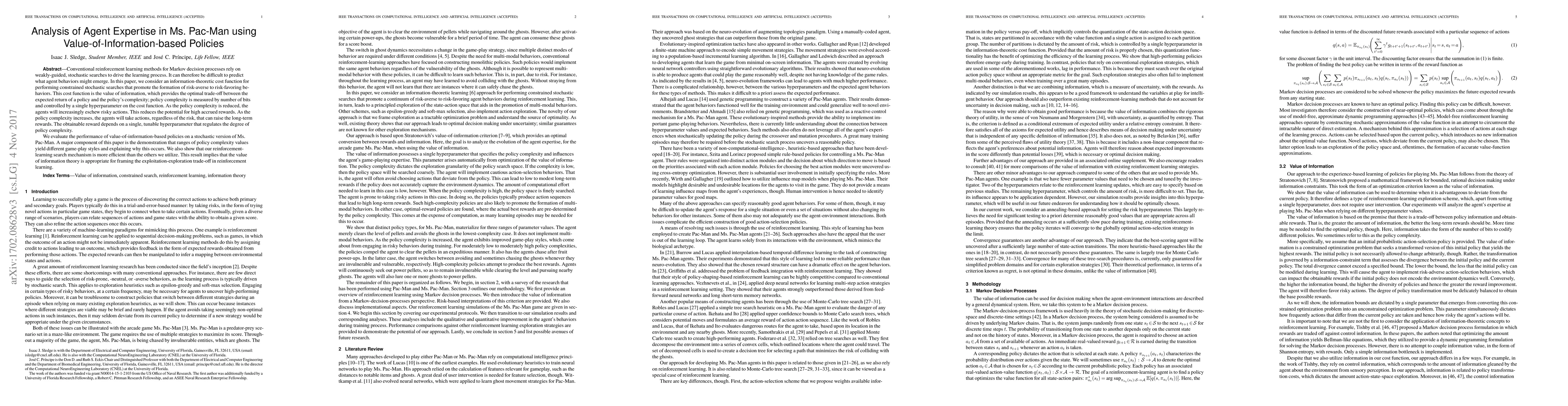 This paper explores the use of value-of-information-based policies to guide the learning process in reinforcement learning, demonstrating their effectiveness in Ms. Pac-Man. The approach balances policy complexity and risk, showing that different complexity levels yield distinct gameplay styles and that the method is more efficient than traditional methods.