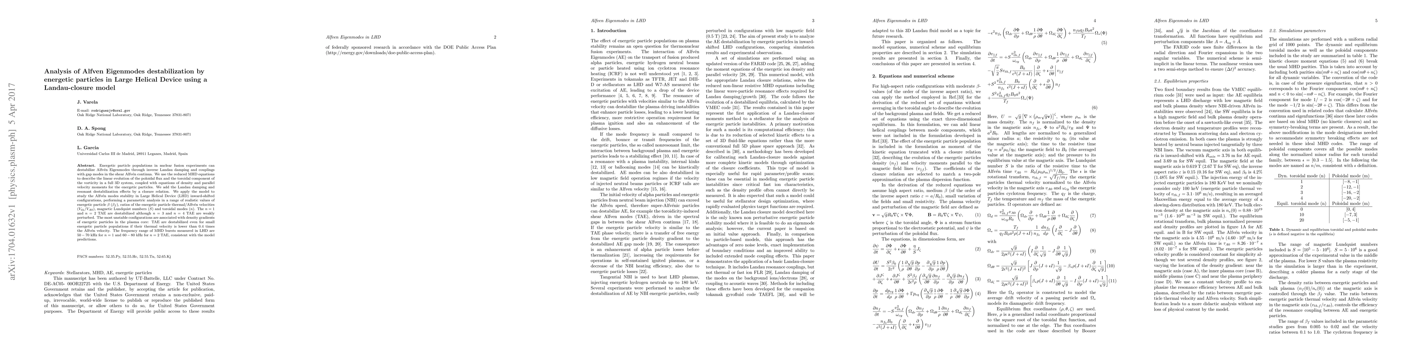 Energetic particle populations in nuclear fusion experiments can destabilize Alfv\' en Eigenmodes through inverse Landau damping and couplings with gap modes in the shear Alfv\' en continua. We use the reduced MHD equations to describe the linear evolution of the poloidal flux and the toroidal component of the vorticity in a full 3D system, coupled with equations of density and parallel velocity moments for the energetic particles. We add the Landau damping and resonant destabilization effects by a closure relation. We apply the model to study the Alfv\' en modes stability in Large Helical Device (LHD) inward-shifted configurations, performing a parametric analysis in a range of realistic values of energetic particle $\beta$ ($\beta_{f}$), ratios of the energetic particle thermal/Alfv\' en velocities ($V_{th}/V_{A0}$), magnetic Lundquist numbers ($S$) and toroidal modes ($n$). The $n = 1$ and $n = 2$ TAE are destabilized although $n = 3$ and $n = 4$ TAE are weakly perturbed. The most unstable configurations are associated with density gradients of energetic particles in the plasma core: TAE are destabilized even for small energetic particle populations if their thermal velocity is lower than $0.4$ times the Alfv\' en velocity. The frequency range of MHD bursts measured in LHD are $50-70$ kHz for $n=1$ and $60-80$ kHz for $n=2$ TAE, consistent with the model predictions.