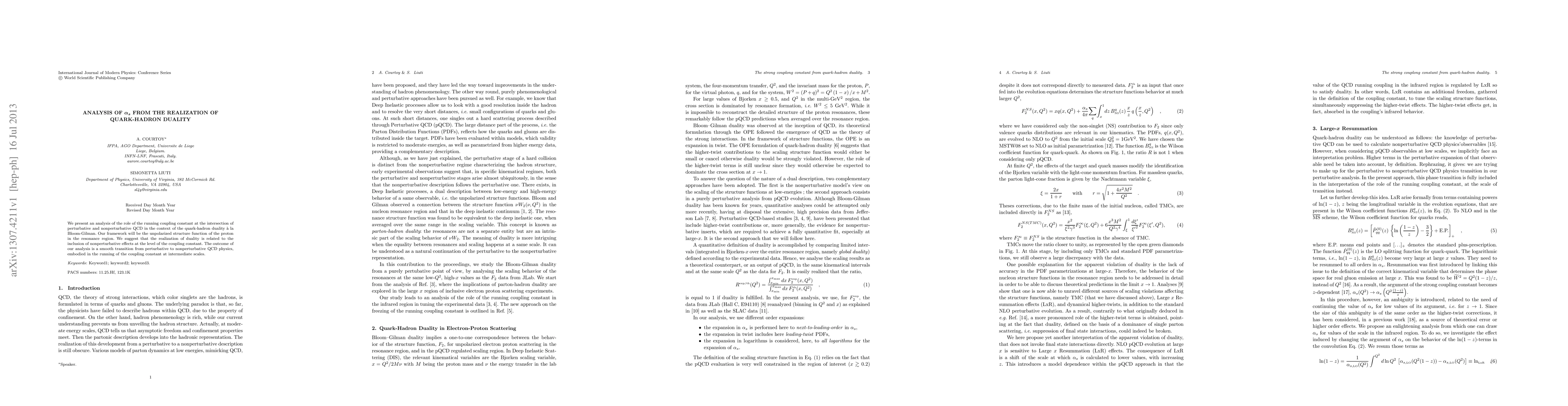 This paper analyzes the role of the running coupling constant $\alpha_s$ at the intersection of perturbative and nonperturbative QCD, focusing on quark-hadron duality in the context of the proton's unpolarized structure function. The study suggests that the realization of quark-hadron duality is linked to the inclusion of nonperturbative effects in $\alpha_s$, leading to a smooth transition between perturbative and nonperturbative QCD physics.