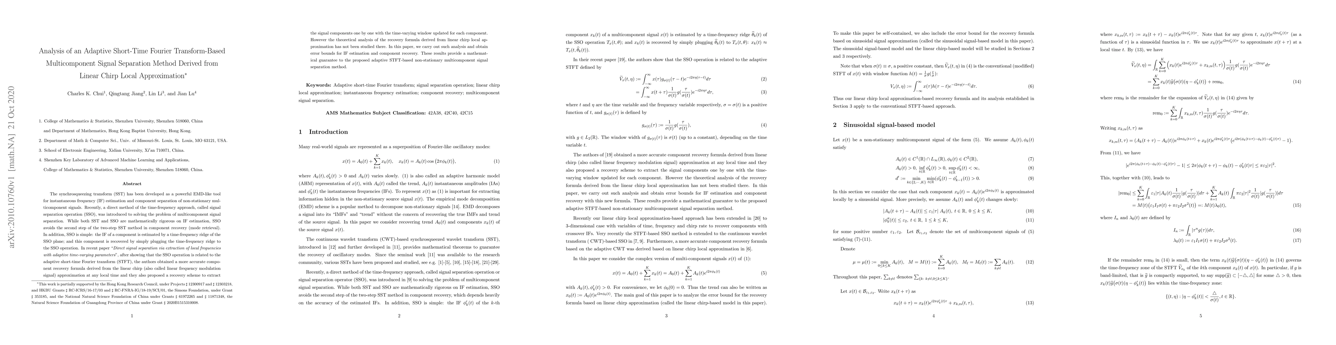 This paper analyzes an adaptive short-time Fourier transform (STFT)-based method for separating non-stationary multicomponent signals, derived from linear chirp local approximation. It provides theoretical error bounds for instantaneous frequency estimation and component recovery, offering mathematical validation for the proposed separation technique.