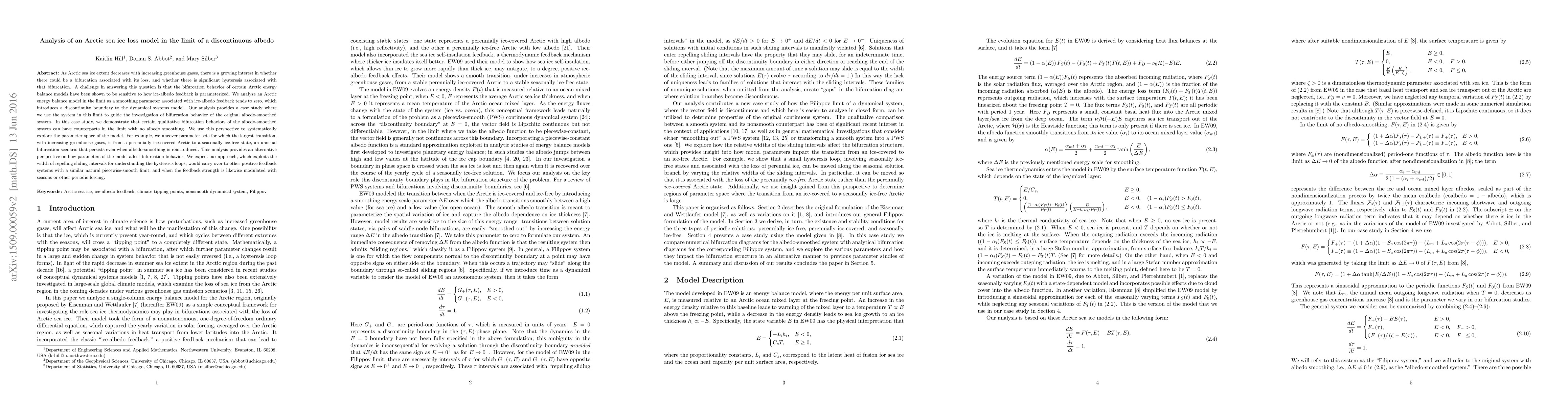 This paper analyzes an Arctic sea ice loss model focusing on the bifurcation behavior when ice-albedo feedback is discontinuous. It demonstrates that qualitative bifurcation behaviors persist even without albedo smoothing, revealing unusual transitions from perennial ice cover to seasonal ice-free states.
