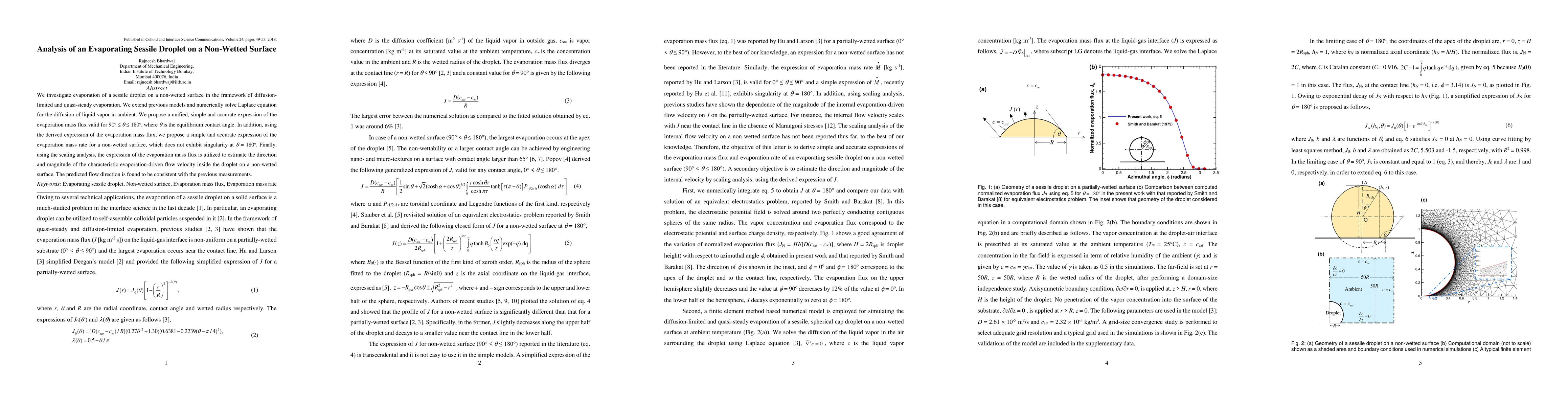 This study develops a unified model for the evaporation of sessile droplets on non-wetted surfaces, extending existing models to accurately describe evaporation mass flux and rate, without singularities, and predicts evaporation-driven flow velocity, consistent with prior measurements.