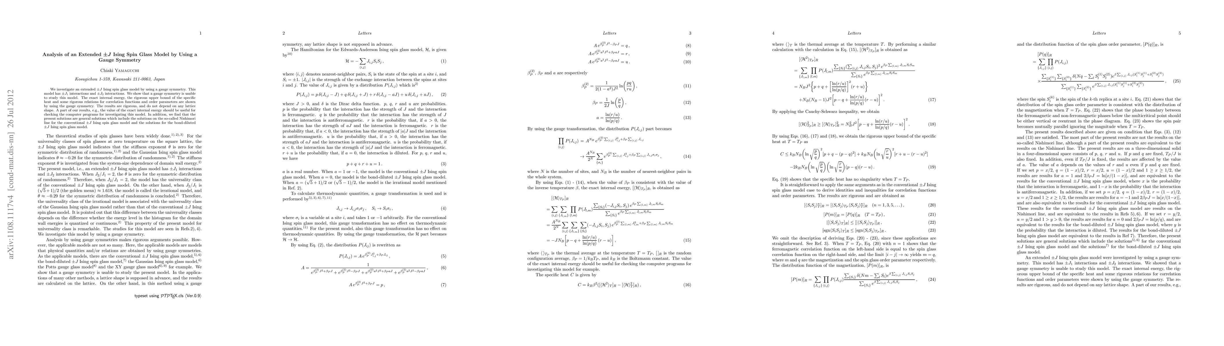 This paper analyzes an extended +-J Ising spin glass model using gauge symmetry, demonstrating rigorous results including the exact internal energy and upper bounds for specific heat, which are lattice-shape independent. The solutions generalize to conventional and bond-diluted models.