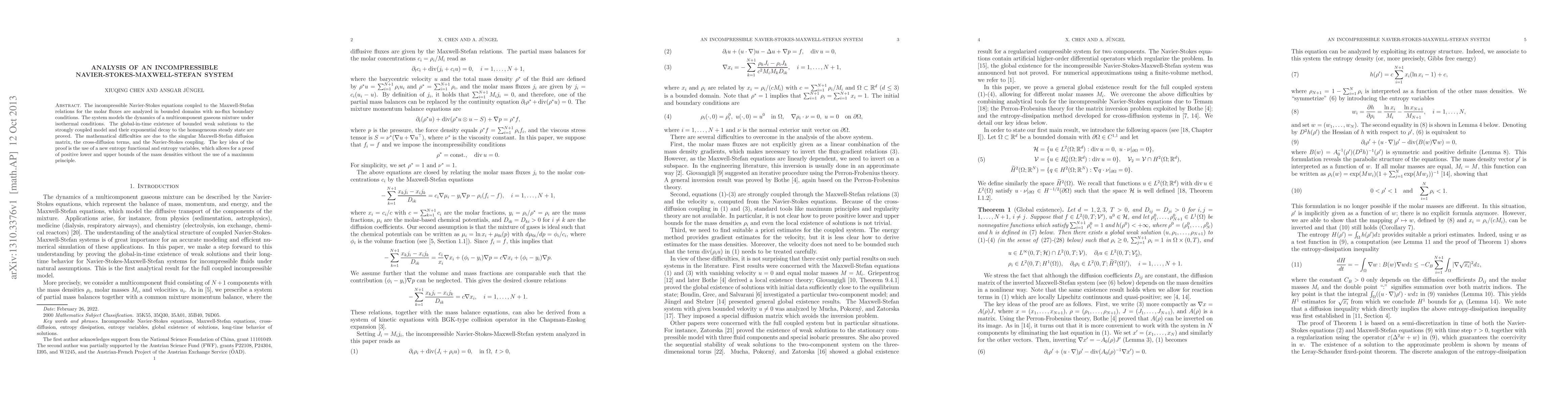 This paper analyzes an incompressible Navier-Stokes-Maxwell-Stefan system modeling multicomponent gaseous mixtures, proving global-in-time existence and exponential decay of bounded weak solutions. The key proof technique involves a new entropy functional and entropy variables, avoiding the need for a maximum principle.