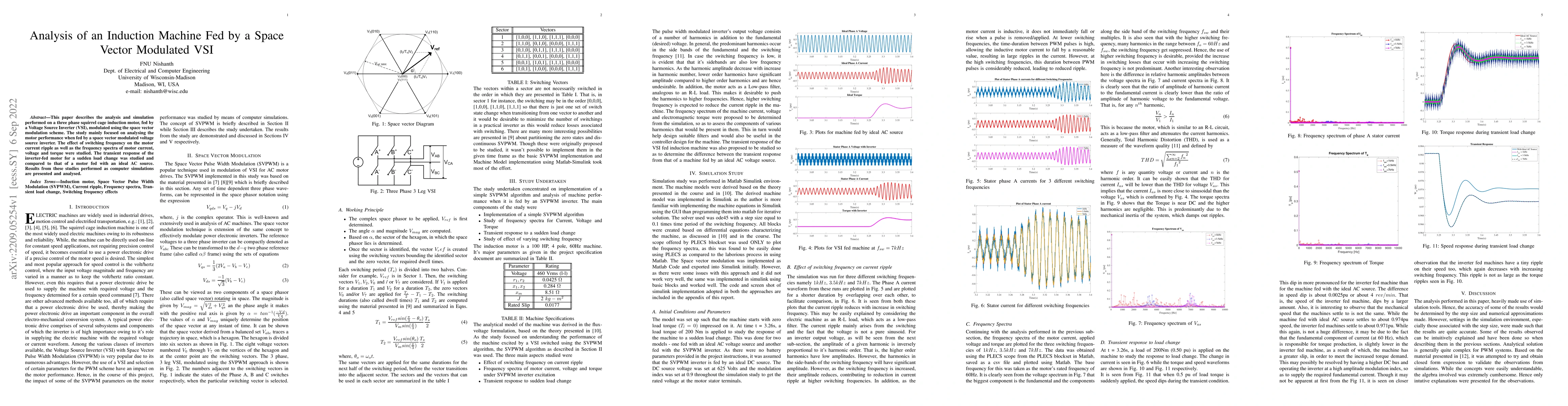 This paper analyzes the performance of a three-phase squirrel cage induction motor driven by a space vector modulated Voltage Source Inverter, focusing on the effects of switching frequency on current ripple and frequency spectra. Simulation results compare the transient response of the inverter-fed motor to that of an ideal AC source during sudden load changes.