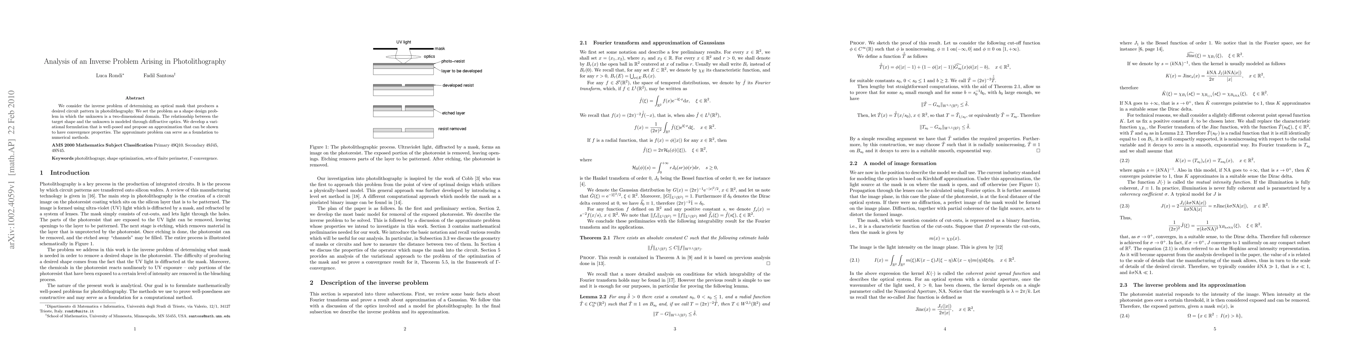 Researchers developed a method to design an optical mask that produces a desired circuit pattern in photolithography through diffractive optics, enabling a well-posed variational formulation and convergence properties.