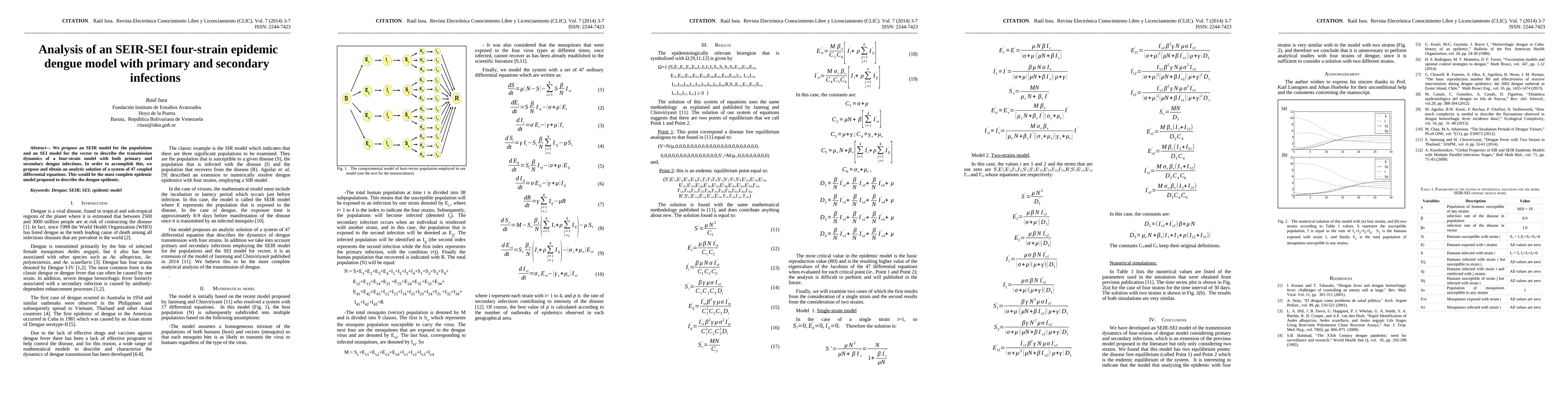 This paper proposes an SEIR-SEI four-strain epidemic model to describe dengue transmission dynamics, including both primary and secondary infections, and provides an analytic solution for a system of 47 coupled differential equations, aiming to offer the most comprehensive dengue epidemic model to date.