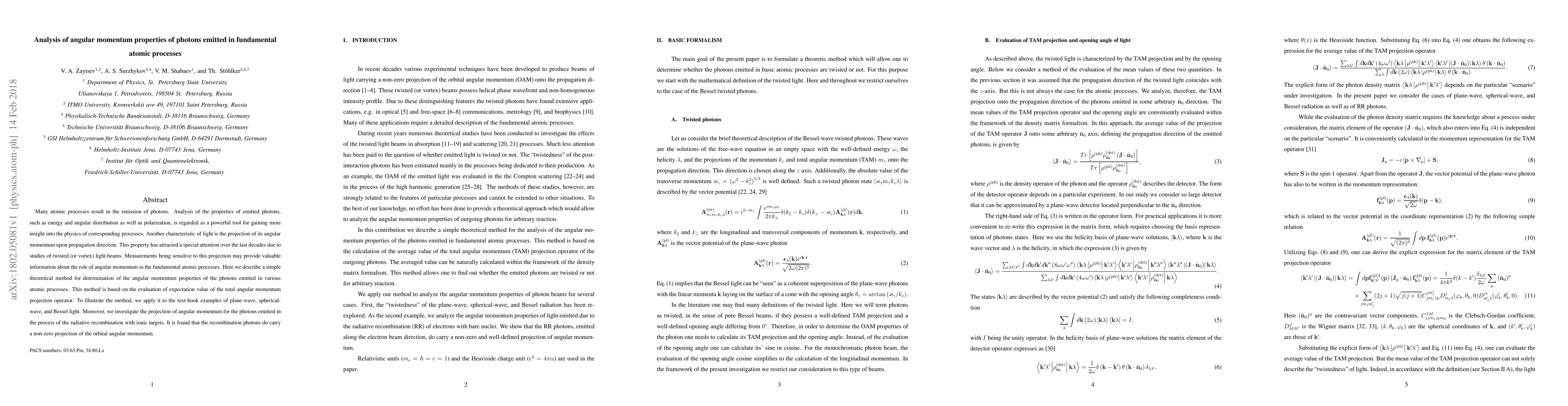 This paper presents a theoretical method to determine the angular momentum properties of photons emitted in fundamental atomic processes, focusing on the projection of angular momentum. The method evaluates the expectation value of the angular momentum projection operator and is applied to various light types and radiative recombination processes, revealing that recombination photons carry a non-zero orbital angular momentum projection.